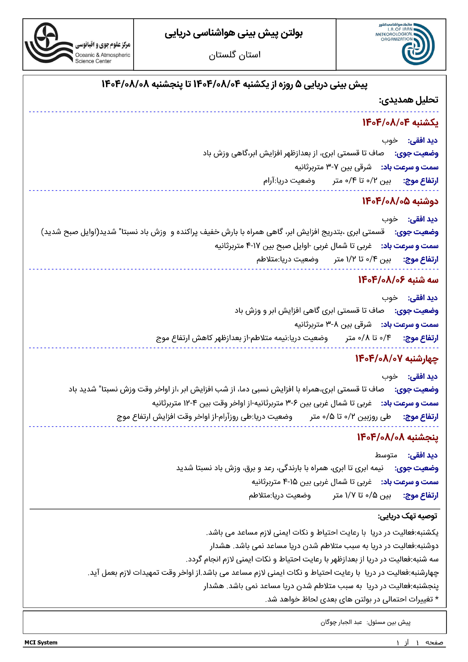 بولتن پیش بینی هواشناسی دریایی 5 روزه مورخه 1404/08/04