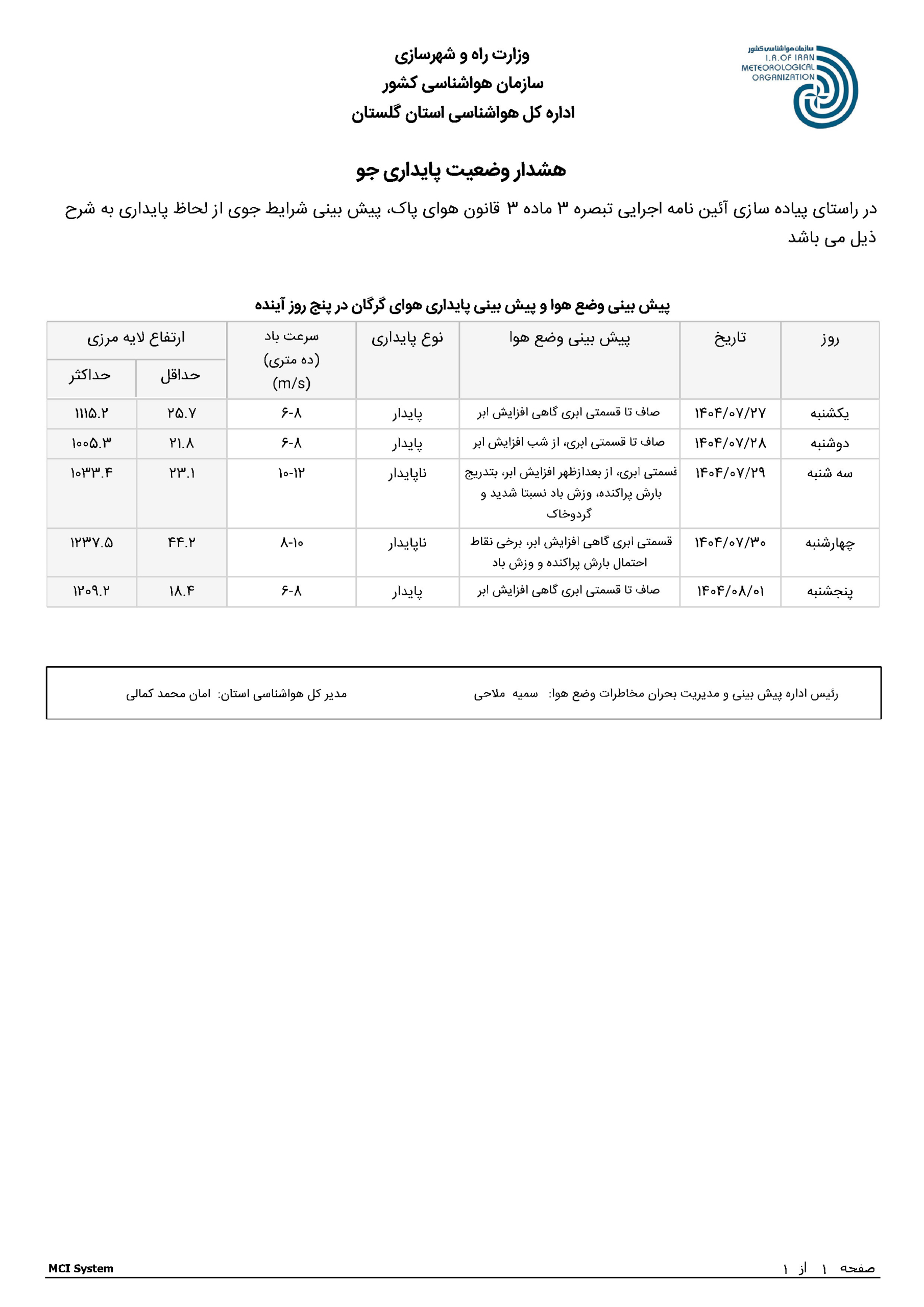 بولتن 5 روزه آلودگی شهرستان گرگان مورخ 1404/07/27