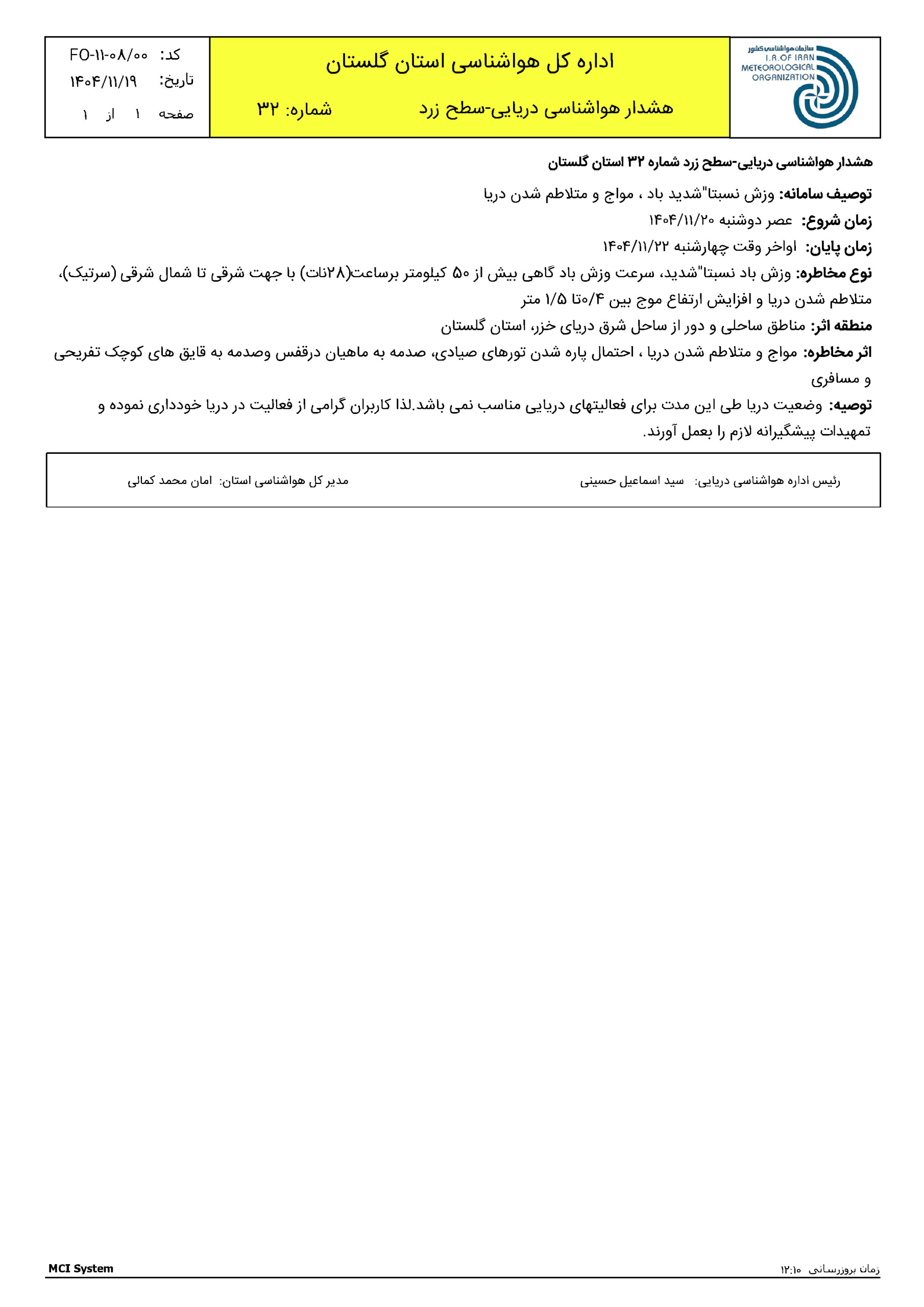 هشدار هواشناسی دریایی سطح زرد شماره32 مورخه 1404/11/19
