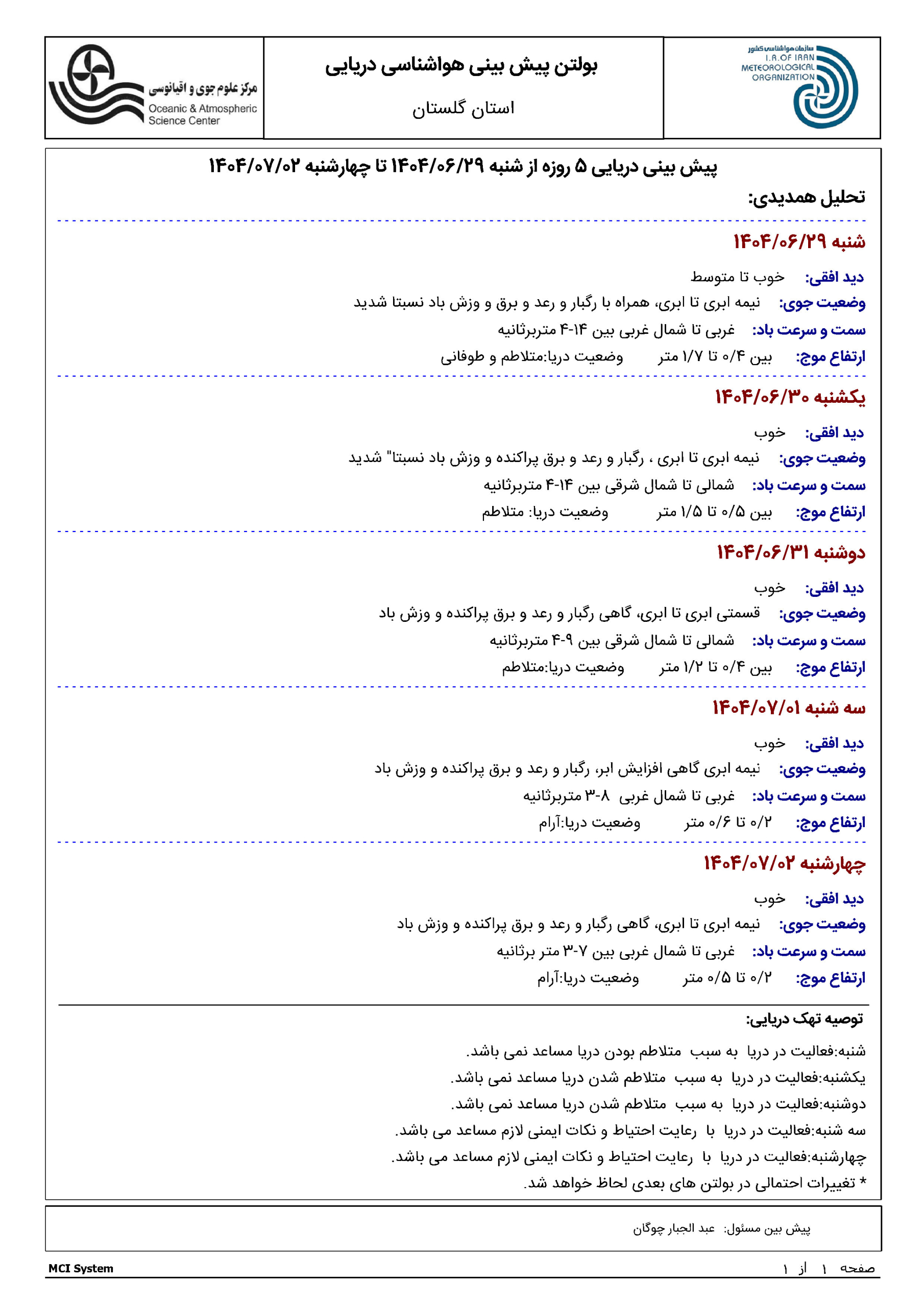 پیش بینی هواشناسی دریایی 5 روزه مورخه 1404/06/29