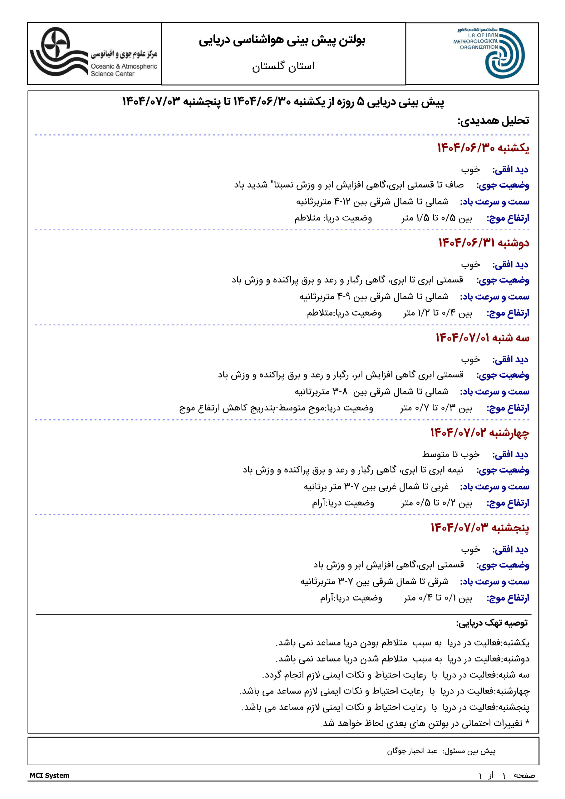 پیش بینی هواشناسی دریایی 5 روزه مورخه 1404/06/30