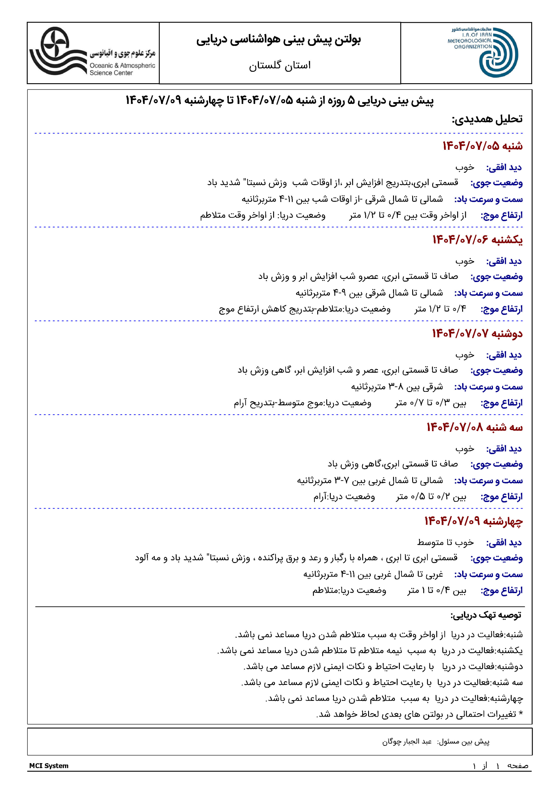 پیش بینی هواشناسی دریایی 5 روزه مورخه 1404/07/05
