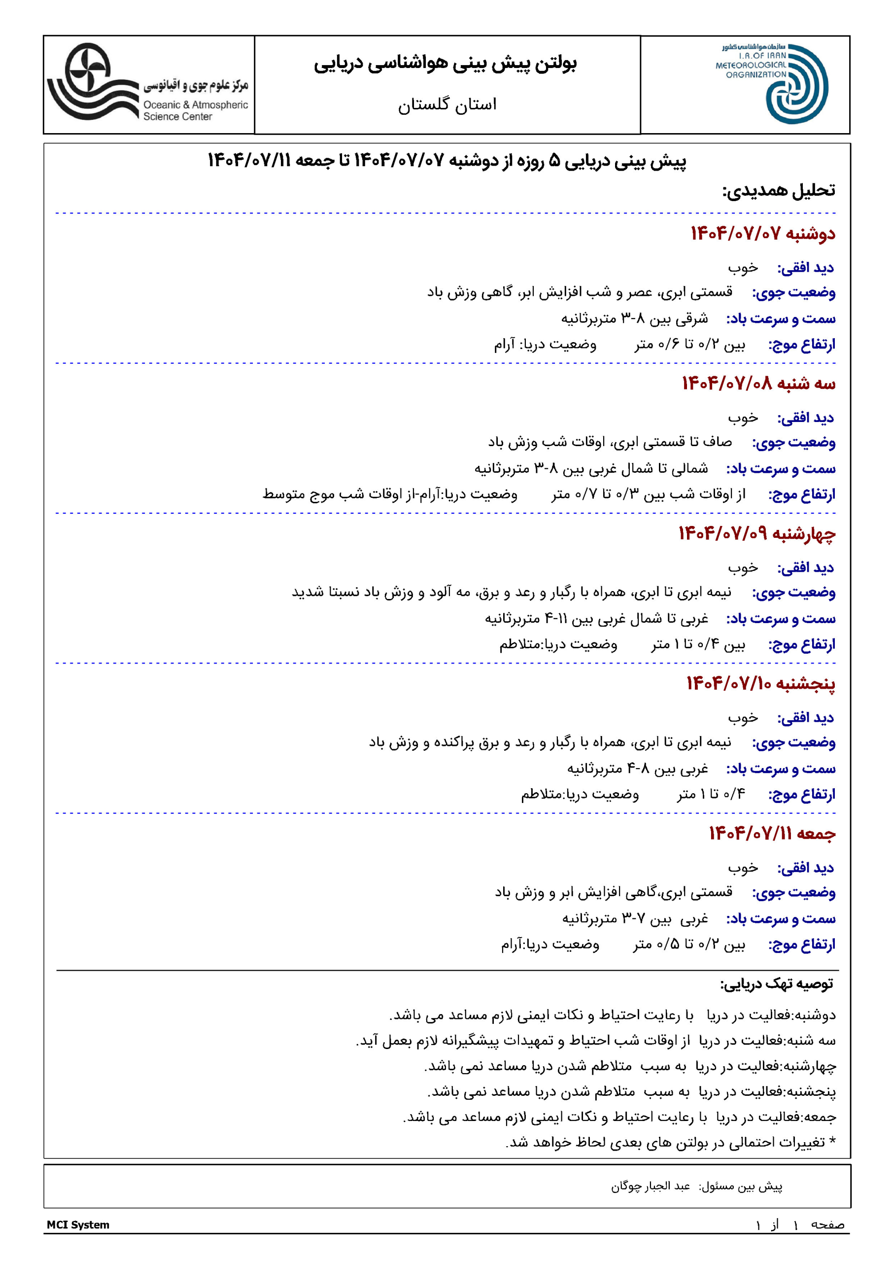 پیش بینی هواشناسی دریایی 5 روزه مورخه 1404/07/07