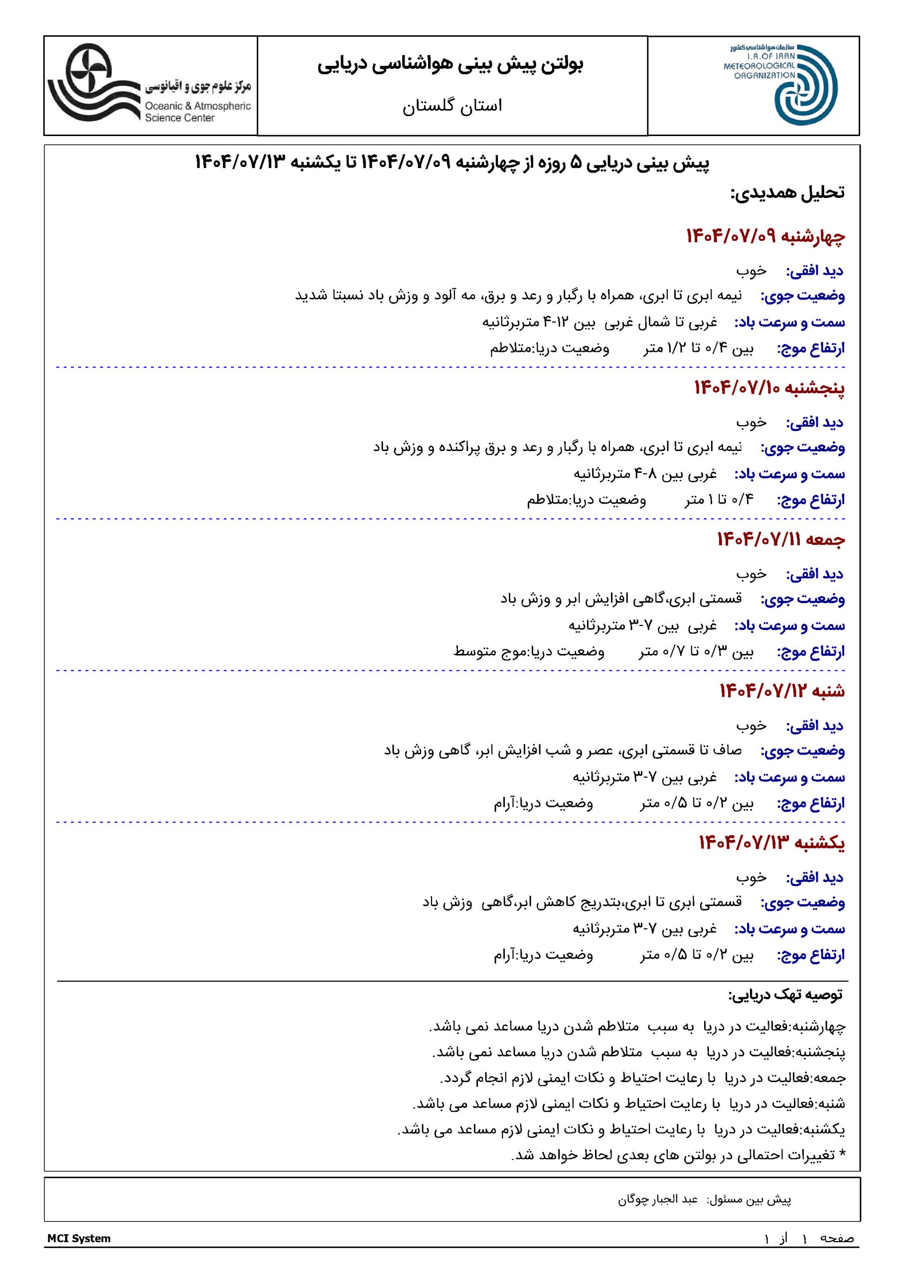 پیش بینی هواشناسی دریایی 5 روزه مورخه 1404/07/09