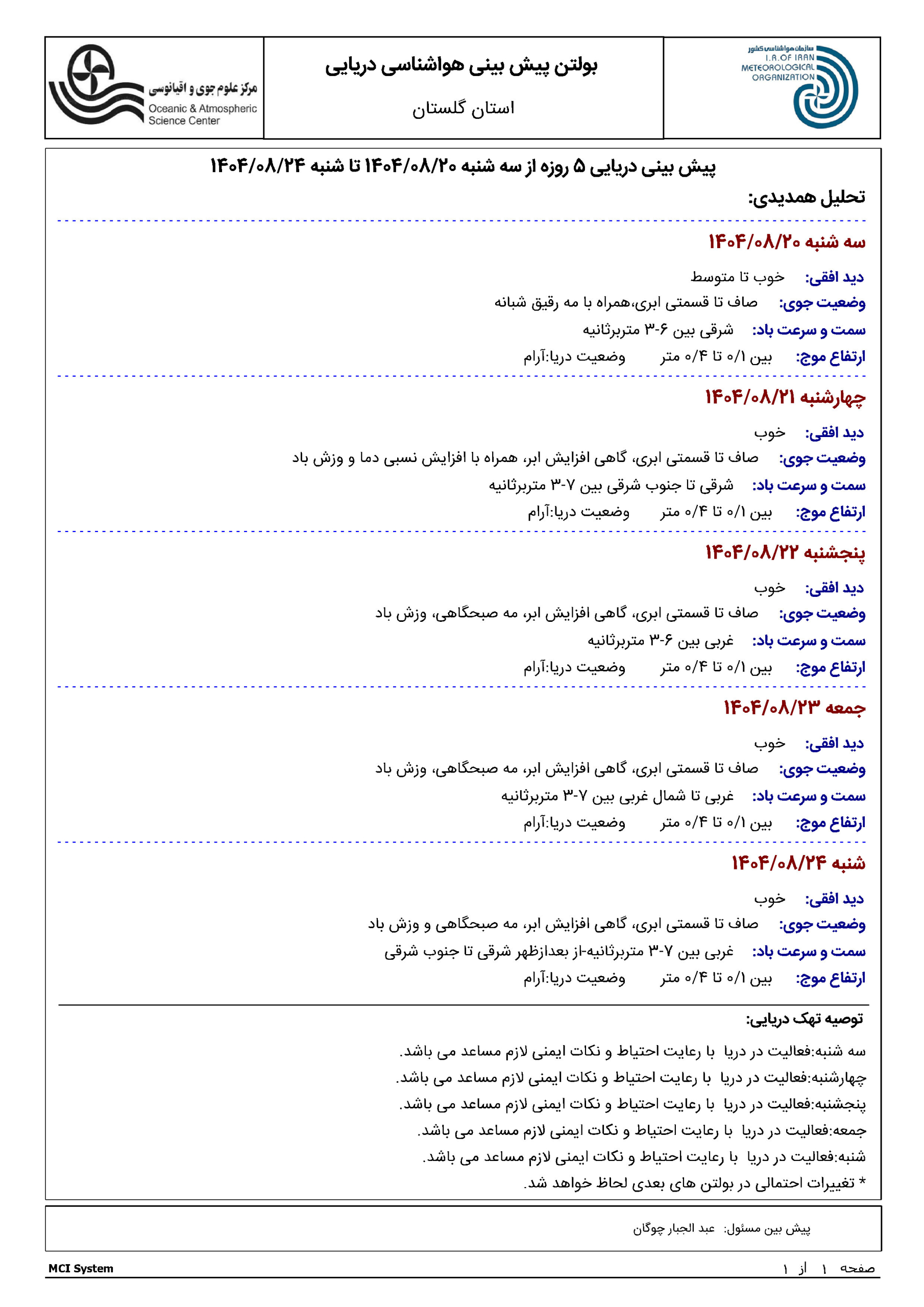 پیش بینی هواشناسی دریایی 5 روزه مورخه 1404/08/21