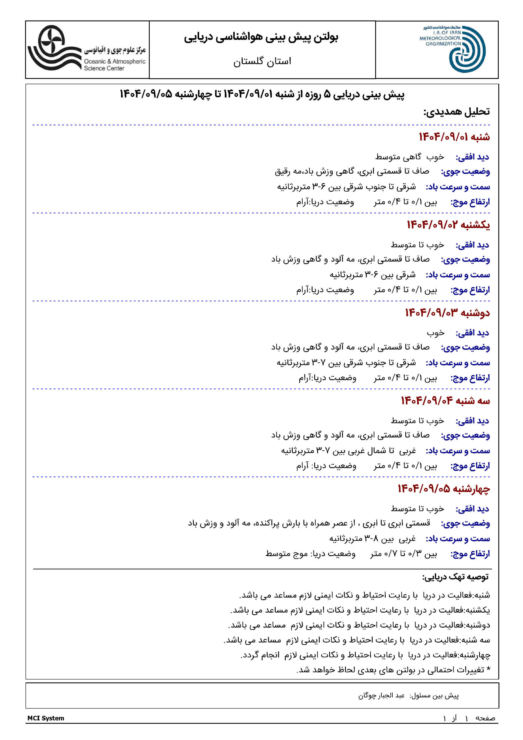 پیش بینی هواشناسی دریایی 5 روزه مورخه 1404/09/01