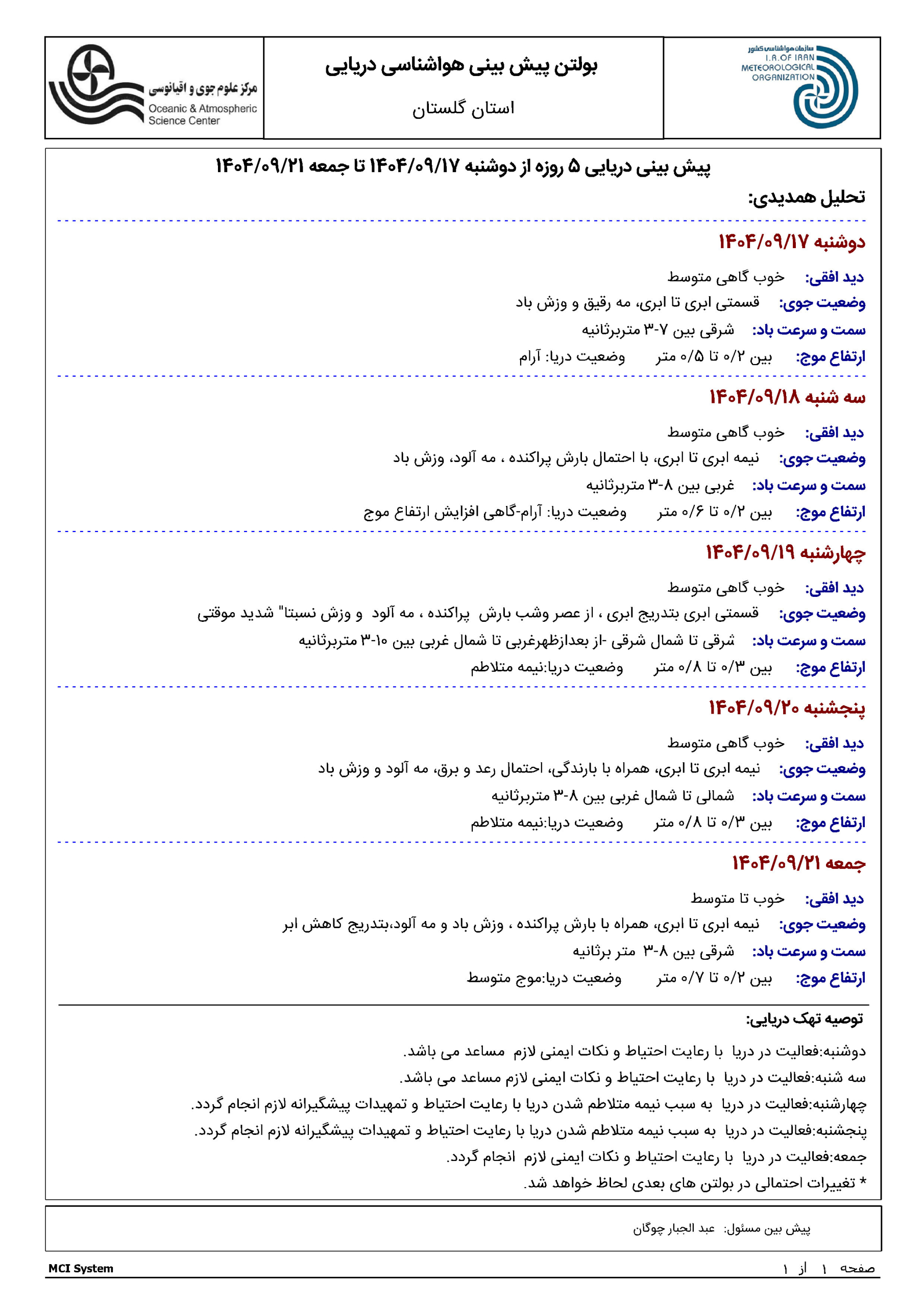 پیش بینی هواشناسی دریایی 5 روزه مورخه 1404/09/17