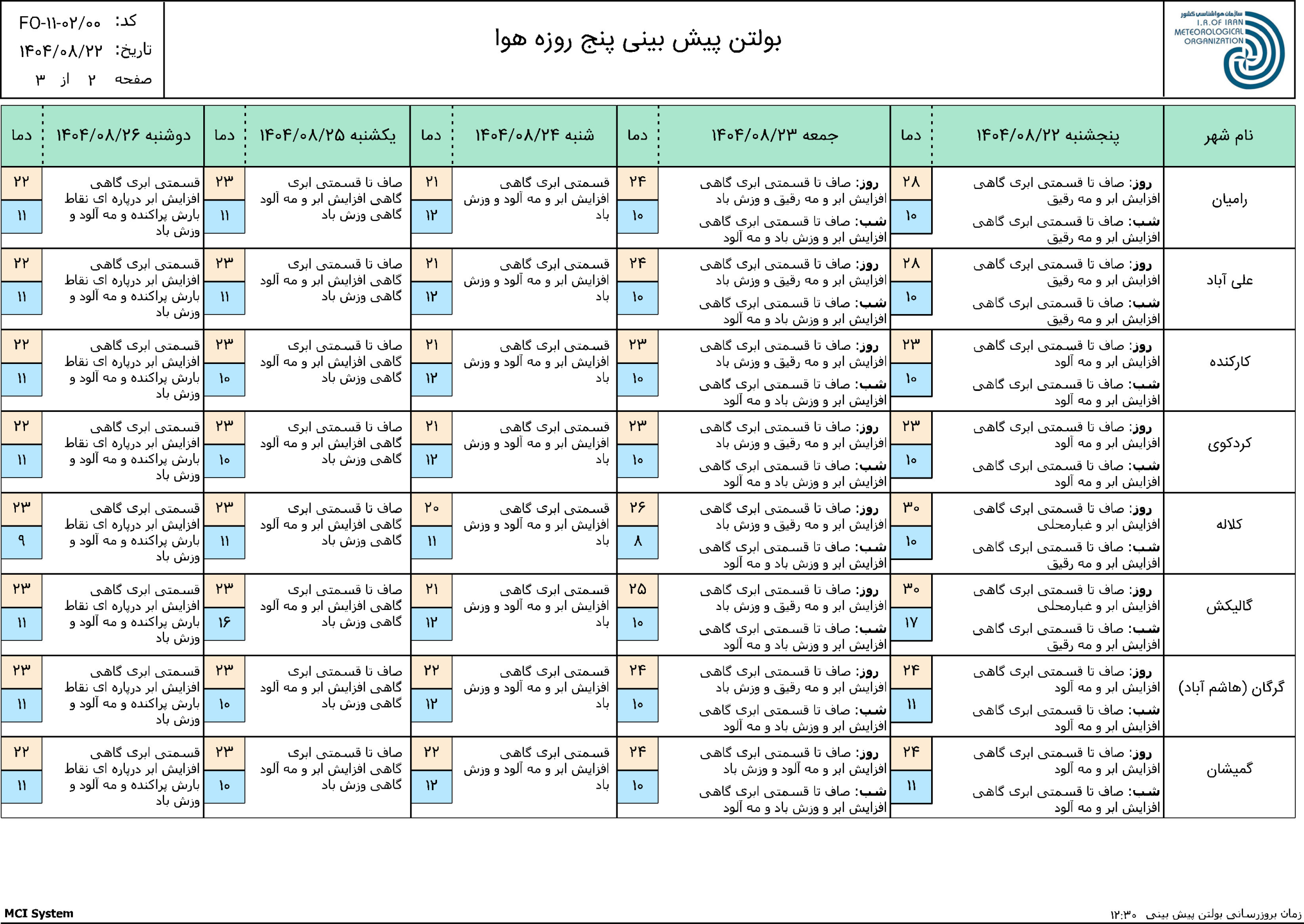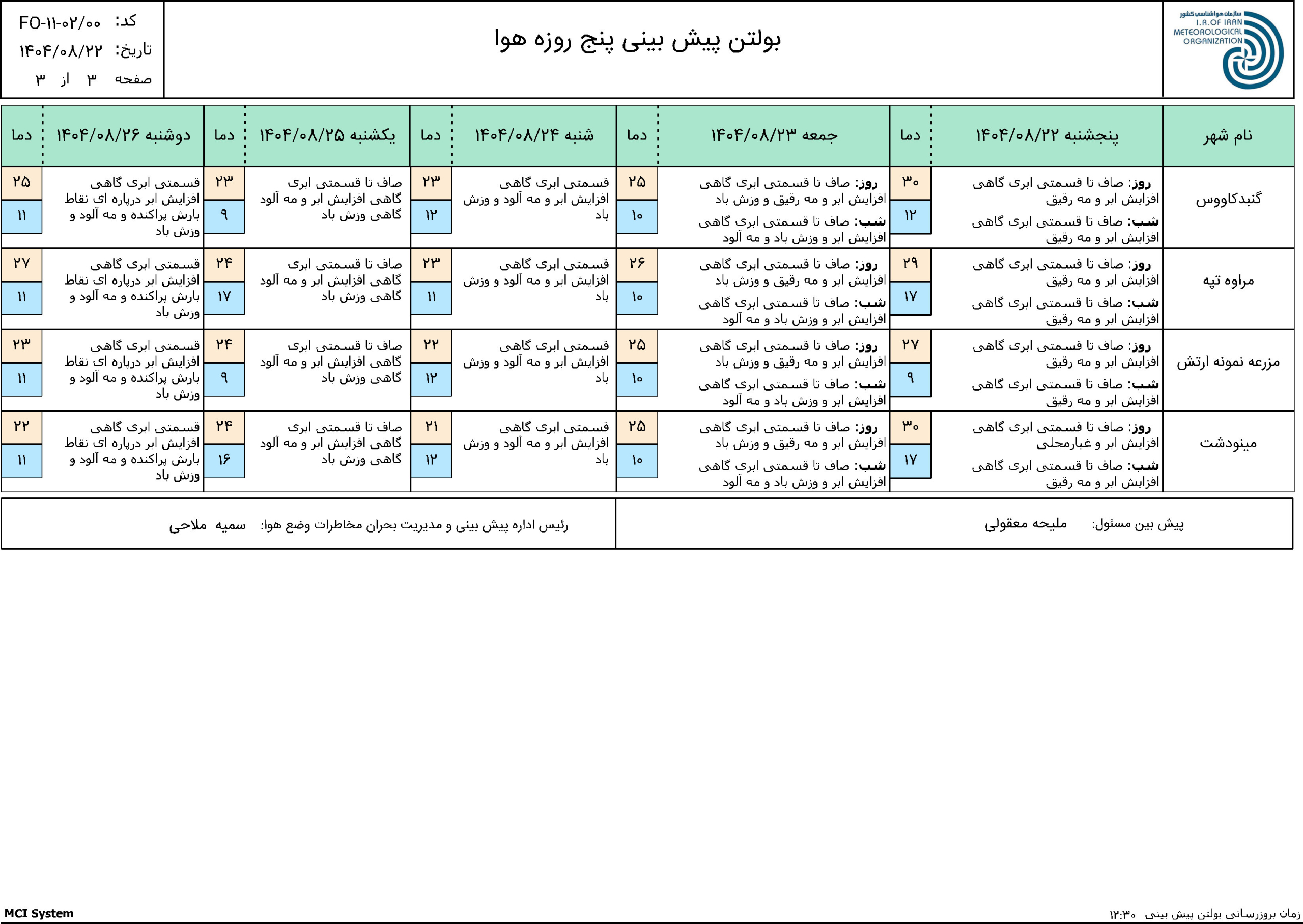 پیش بینی 72 ساعته مورخ 1404/08/22