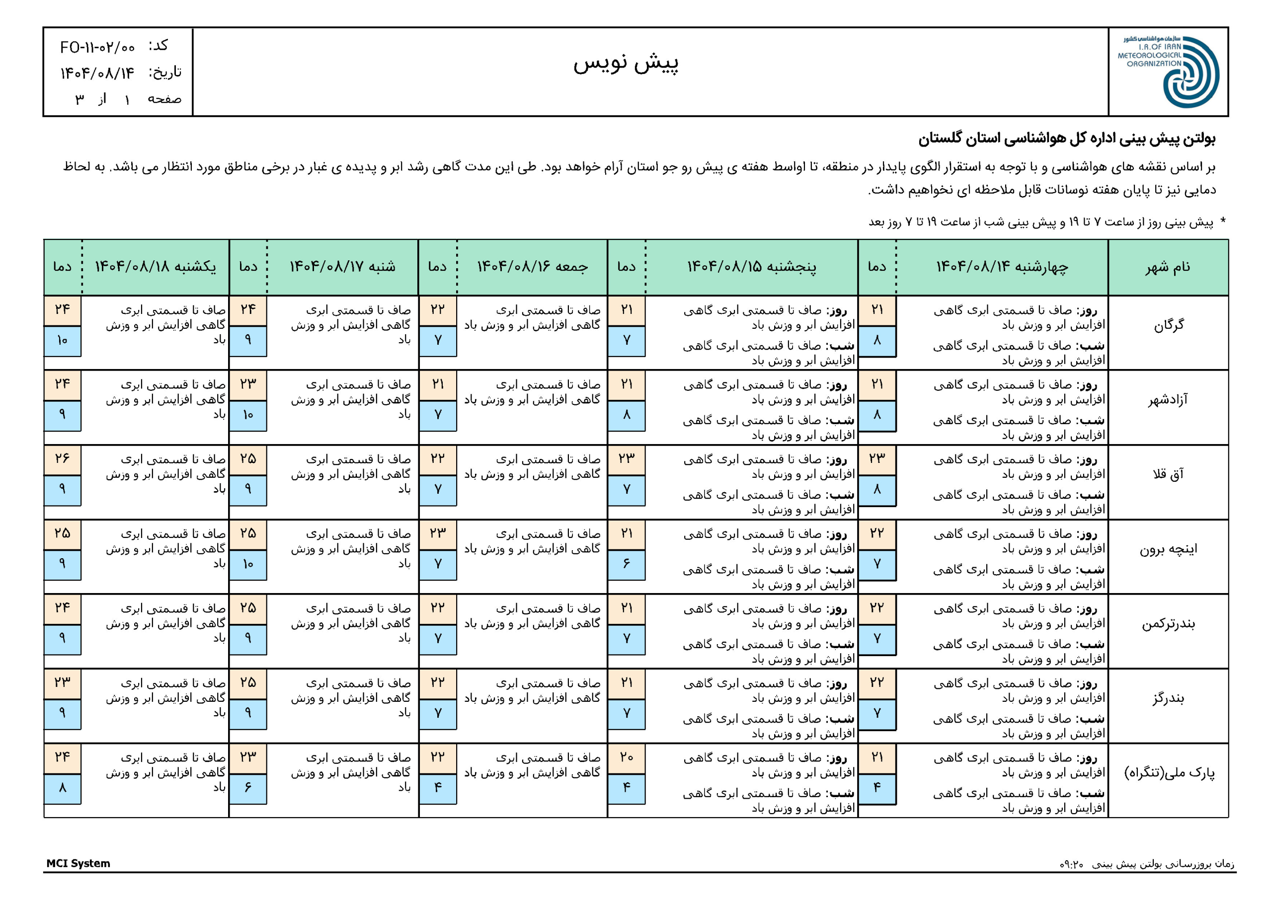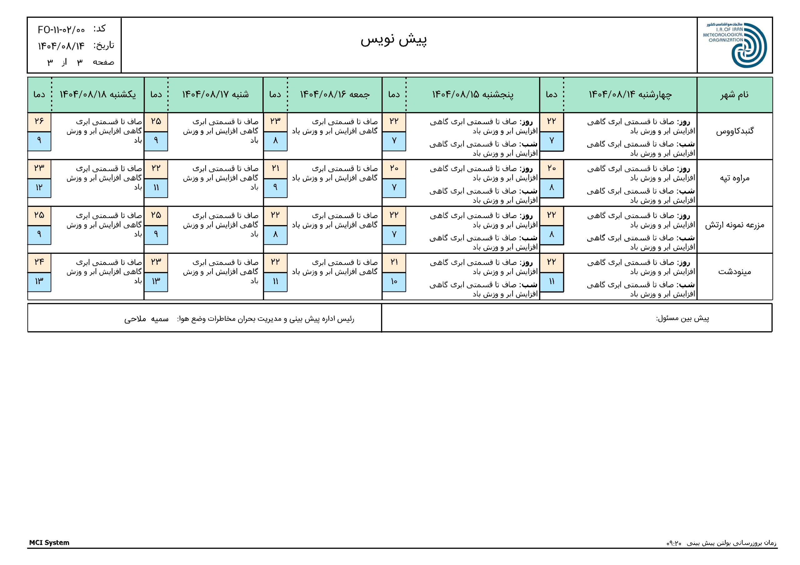 - هشدار هواشناسی جوی سطح نارنجی شماره 10 مورخ 1404/08/066 آبان 1404 - 12:23 ق.ظ