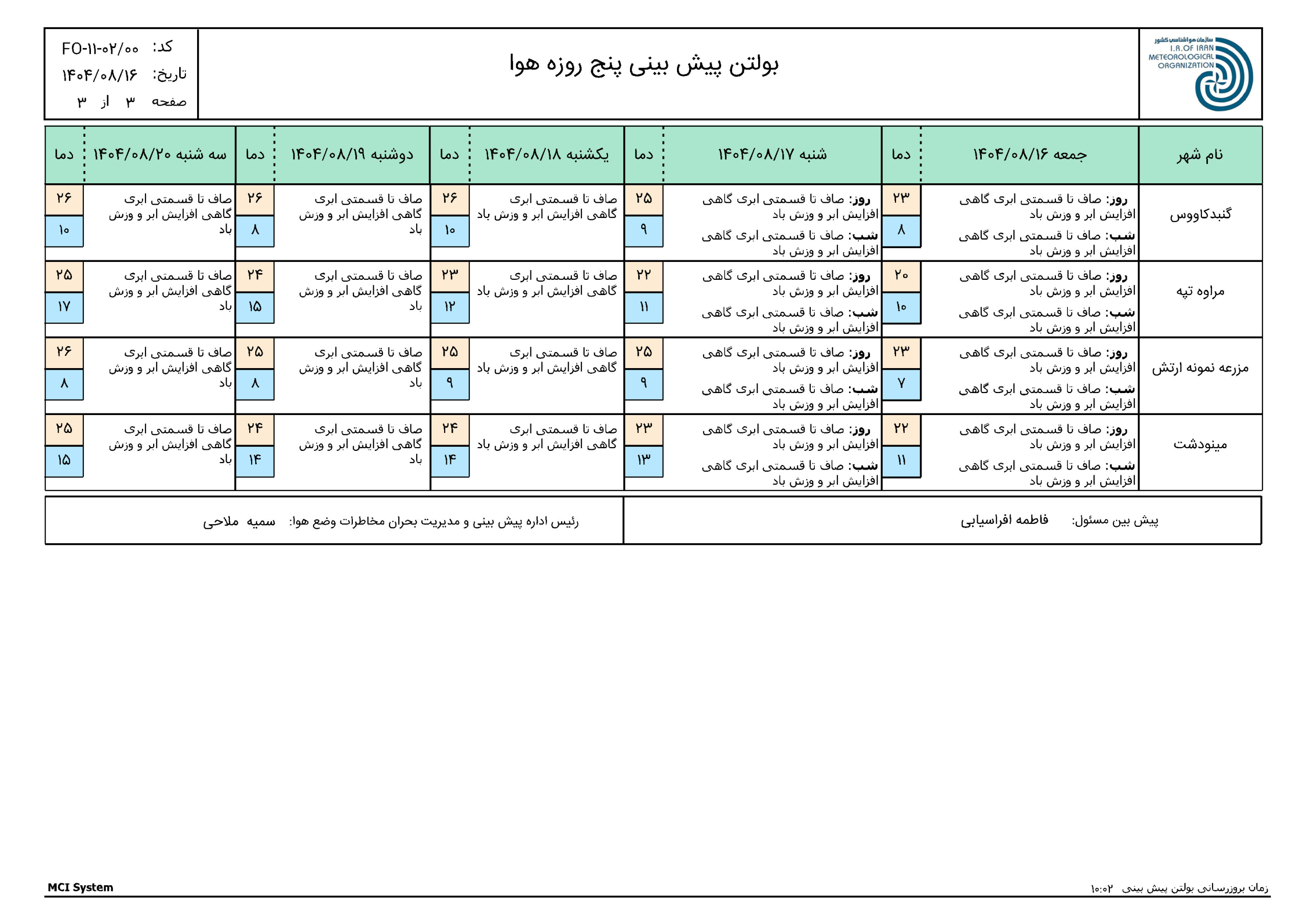 - هشدار هواشناسی جوی سطح نارنجی شماره 10 مورخ 1404/08/066 آبان 1404 - 12:23 ق.ظ