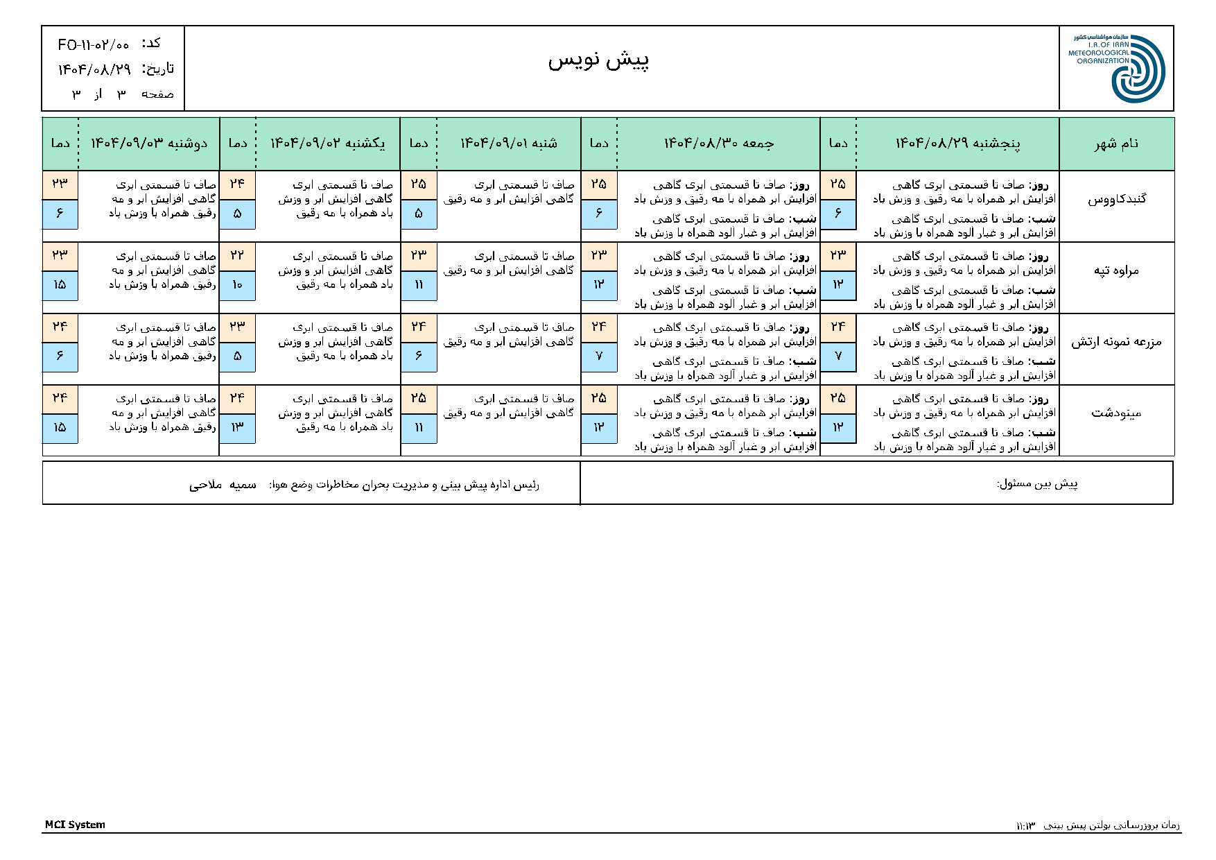کاهش ۱۸ درصدی بارشهای پاییزی در استان گلستان نسبت به دوره بلندمدت18 آبان 1404 - 1:09 ب.ظ- هشدار هواشناسی جوی سطح نارنجی شماره 10 مورخ 1404/08/066 آبان 1404 - 12:23 ق.ظ