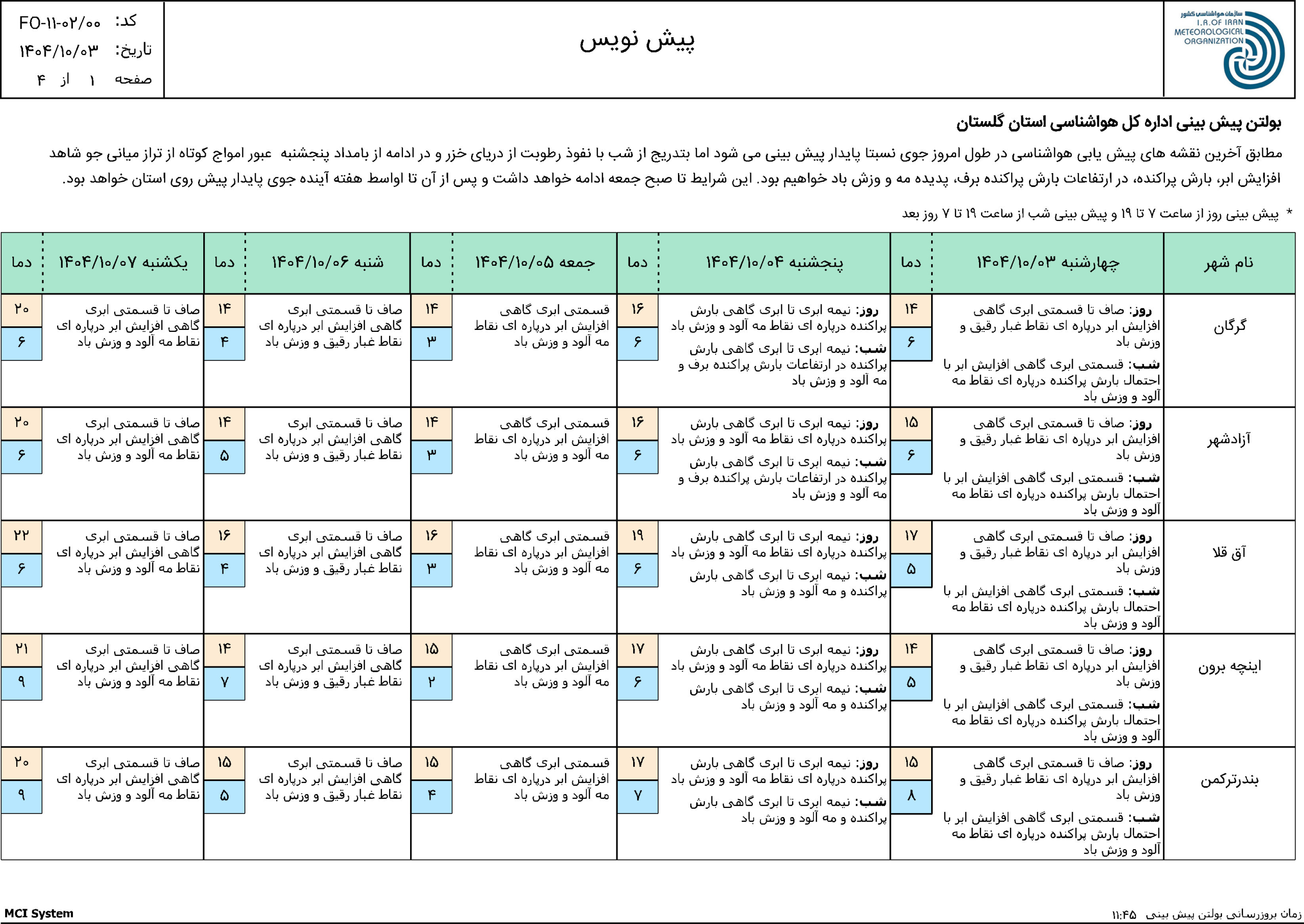پیش بینی 72 ساعته مورخ 1404/10/03