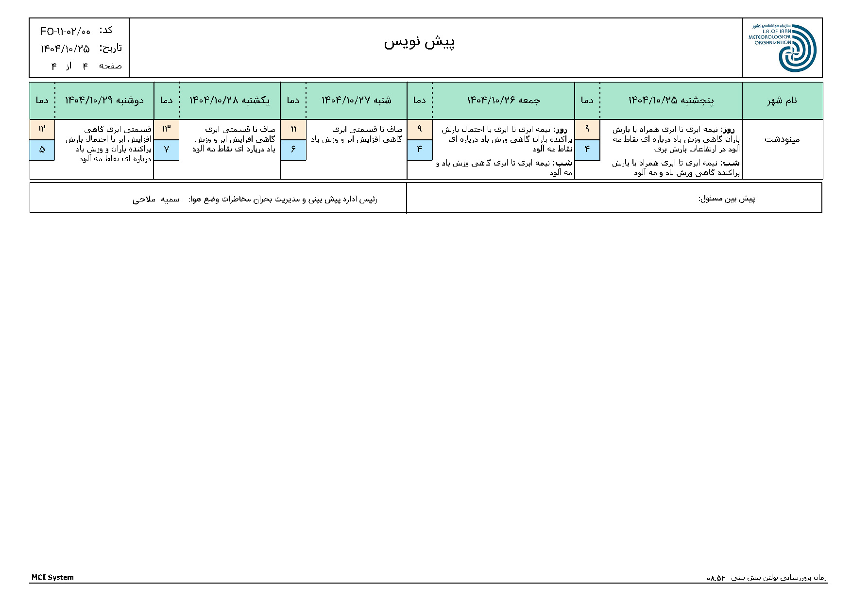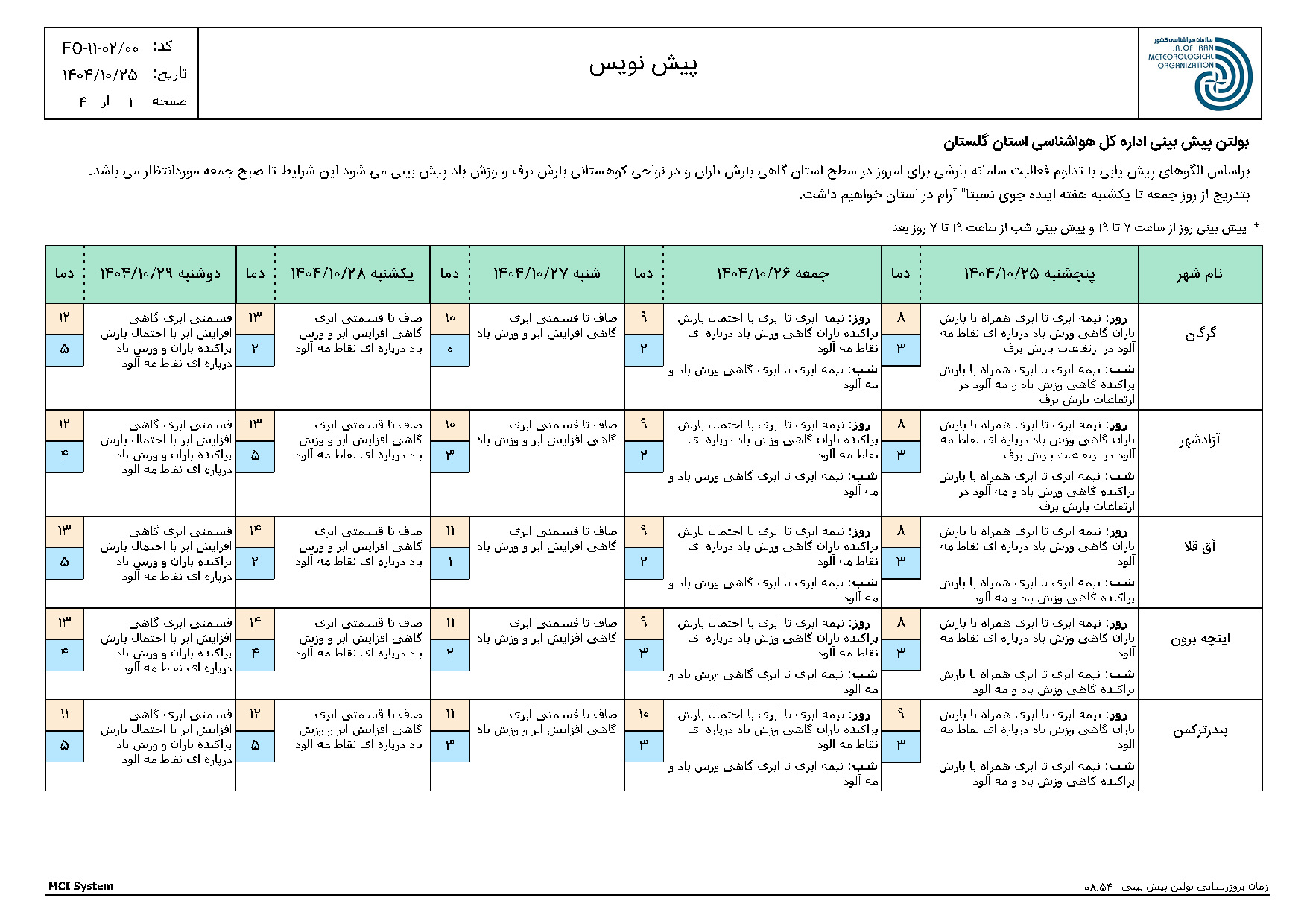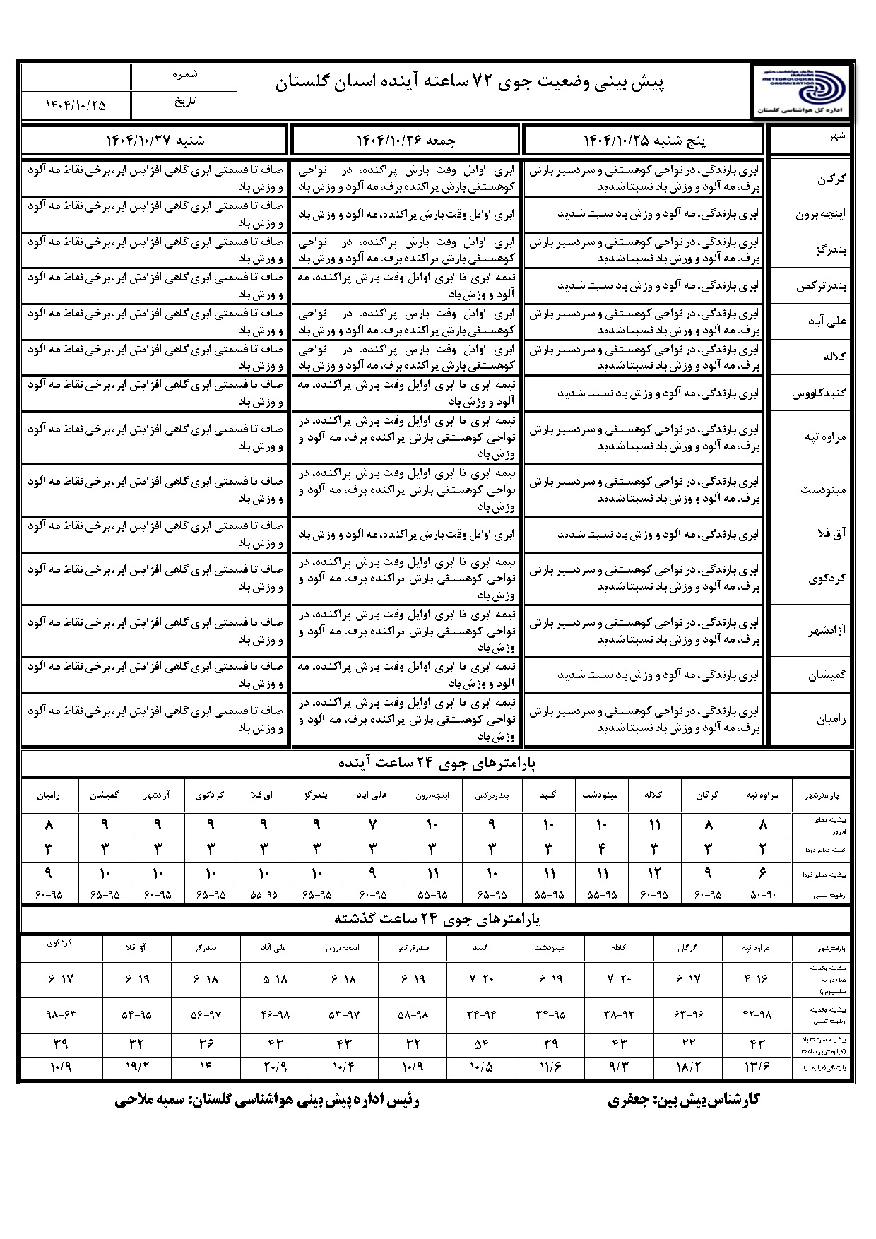 پیش بینی 72 ساعته مورخ 1404/10/25