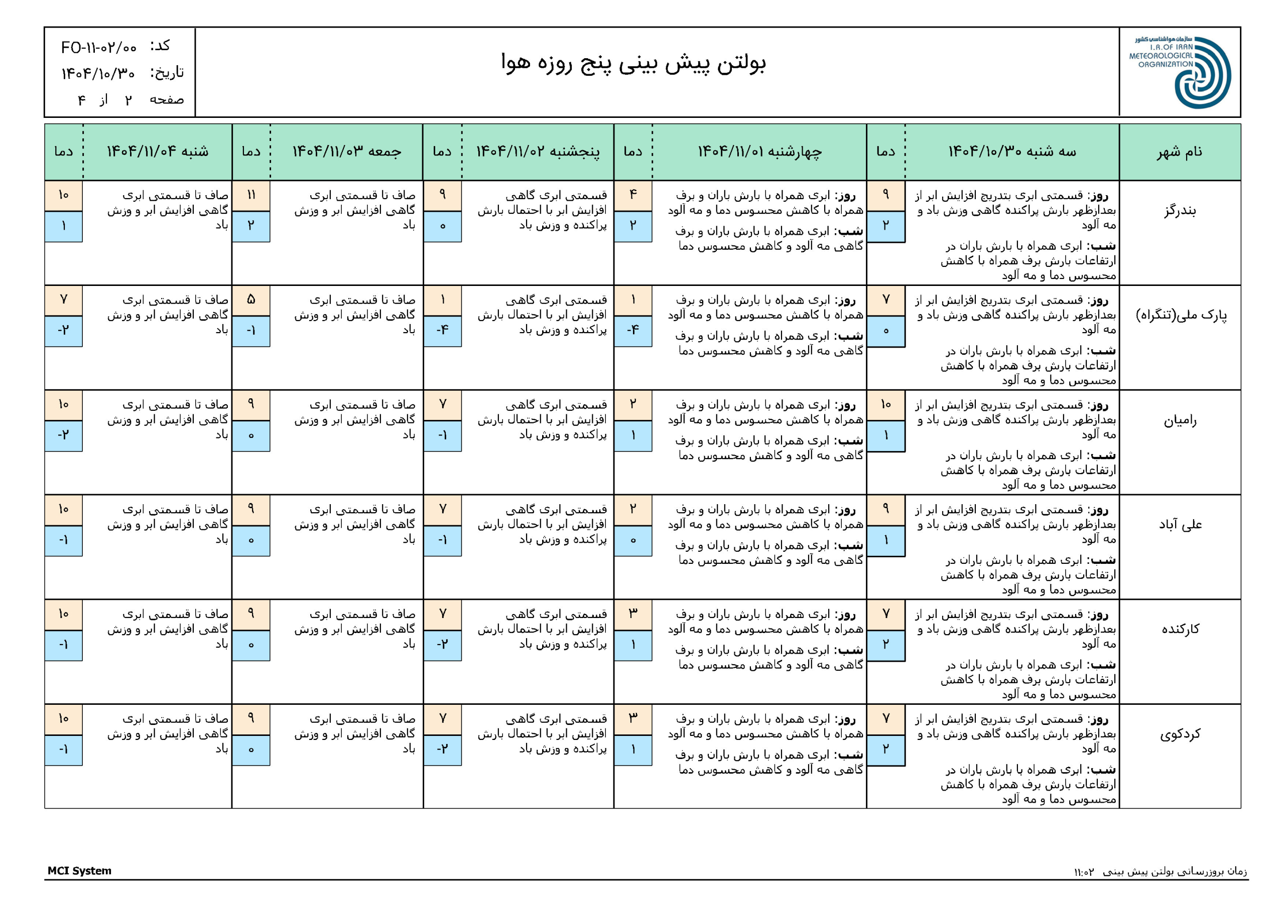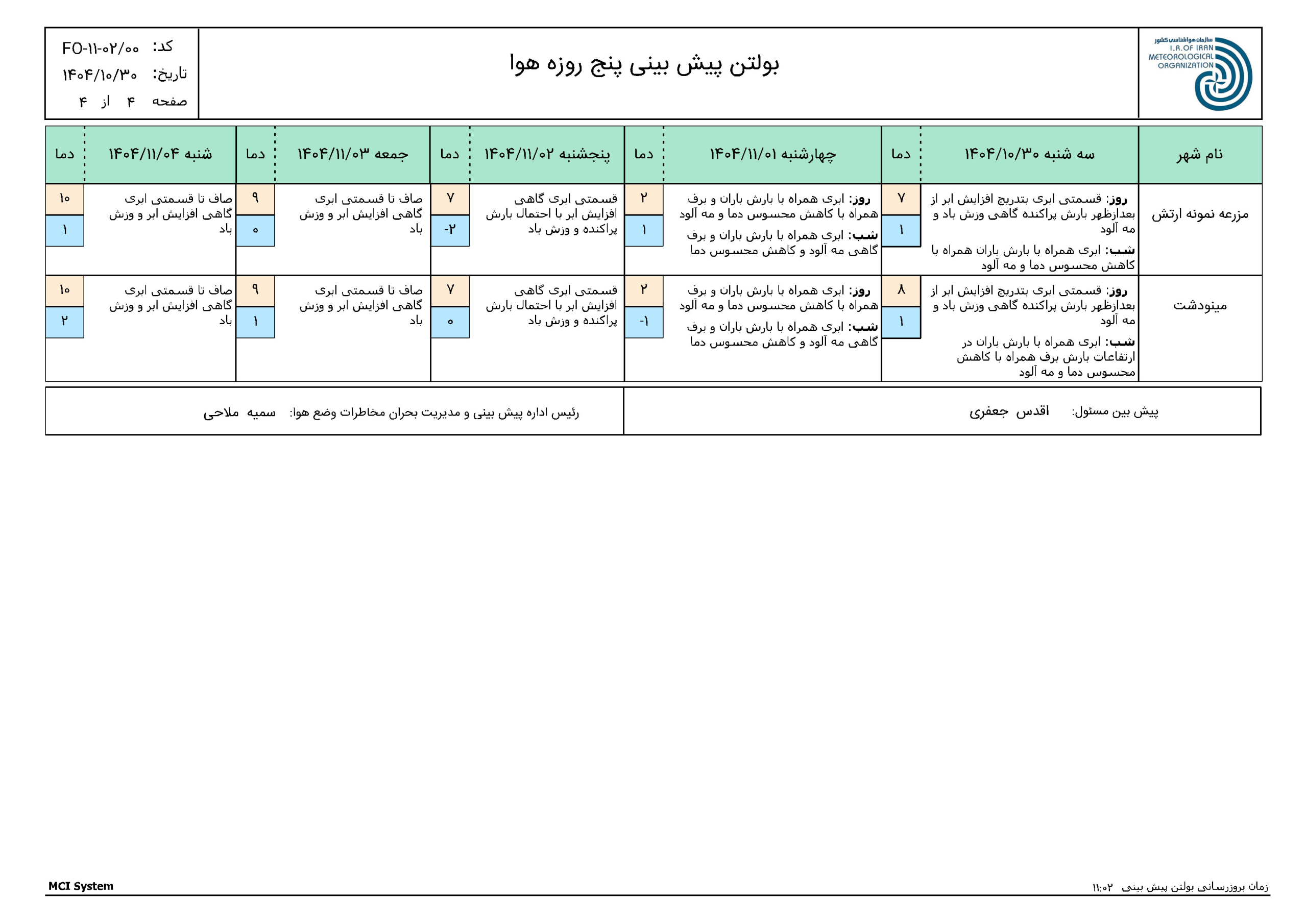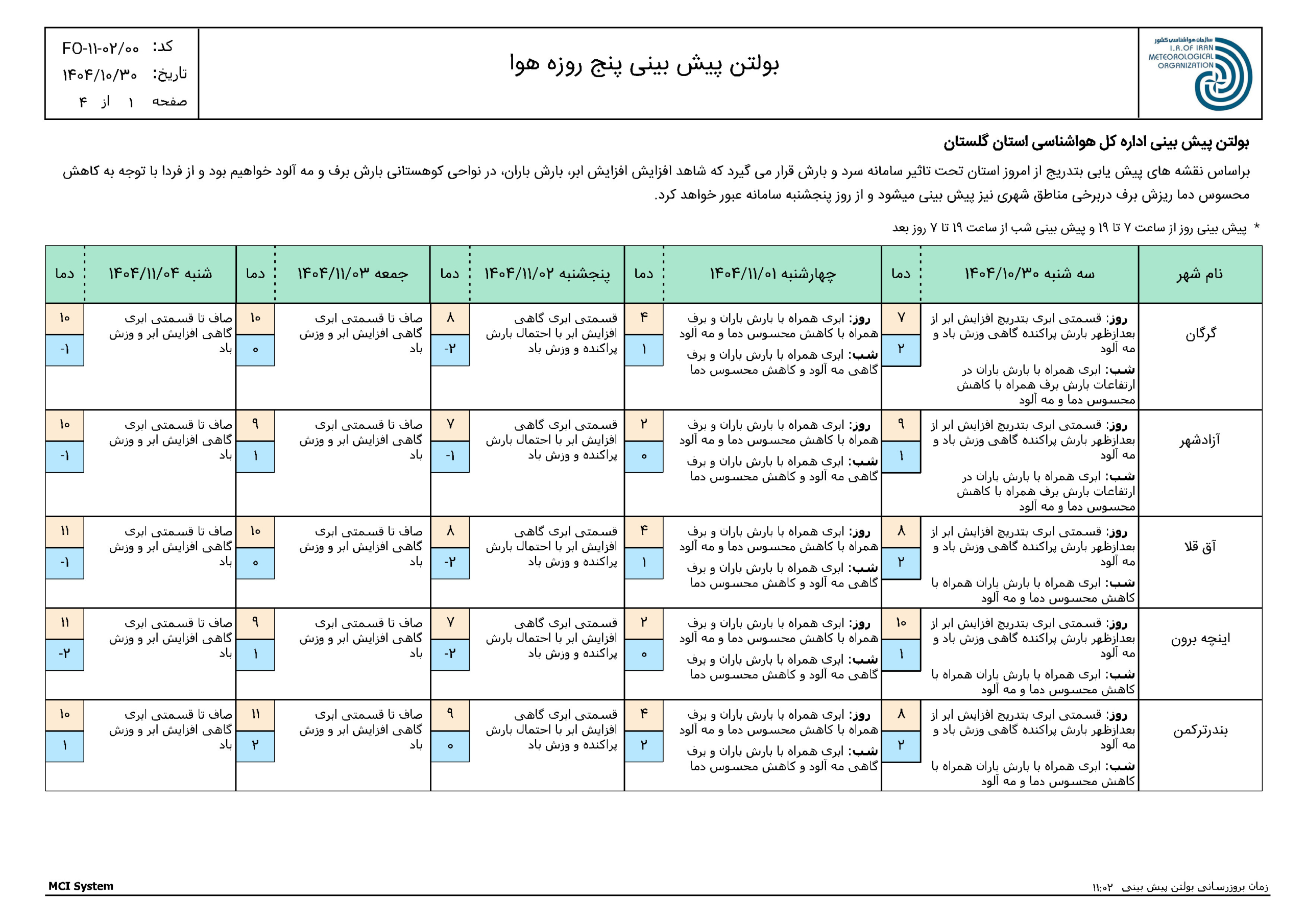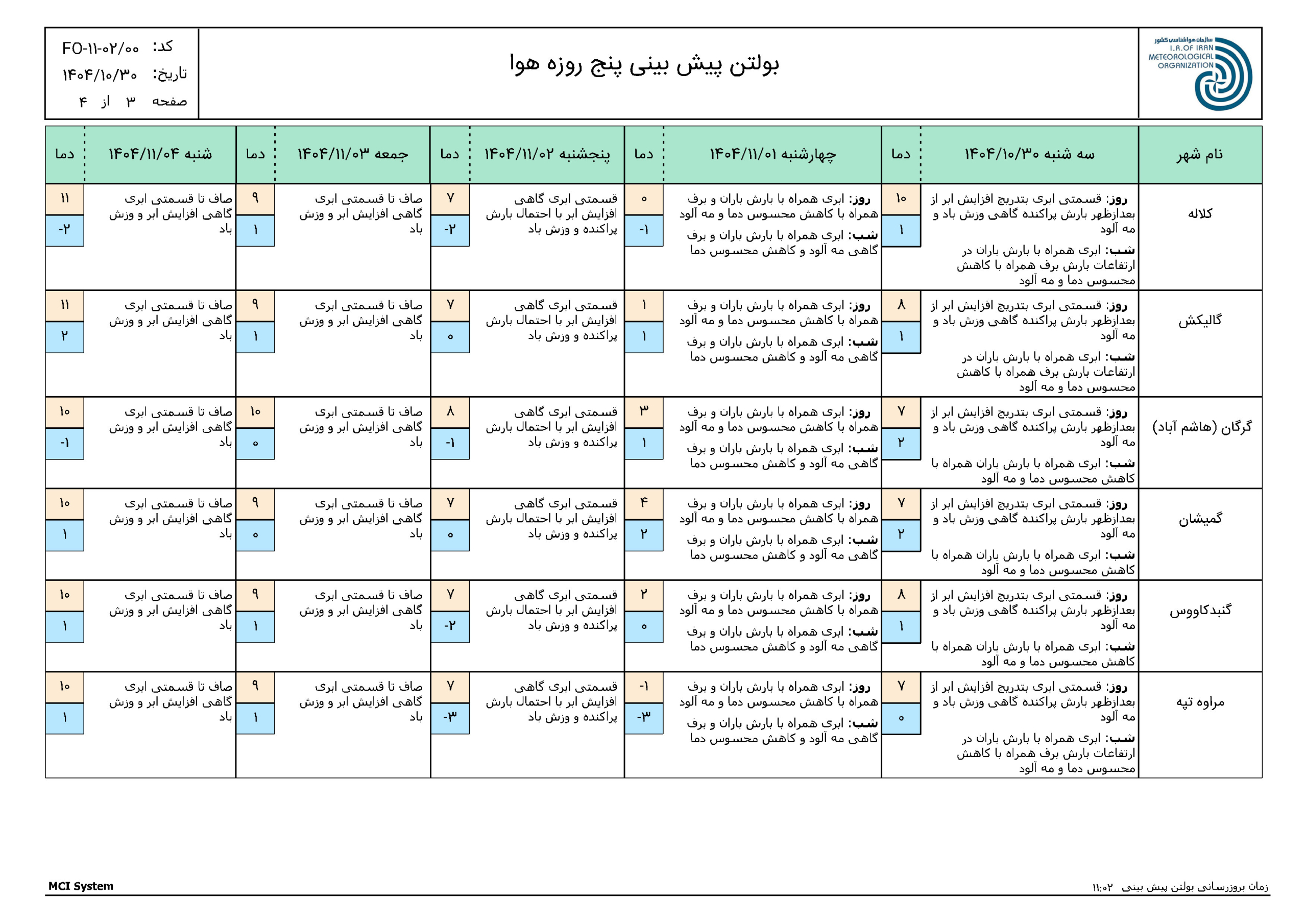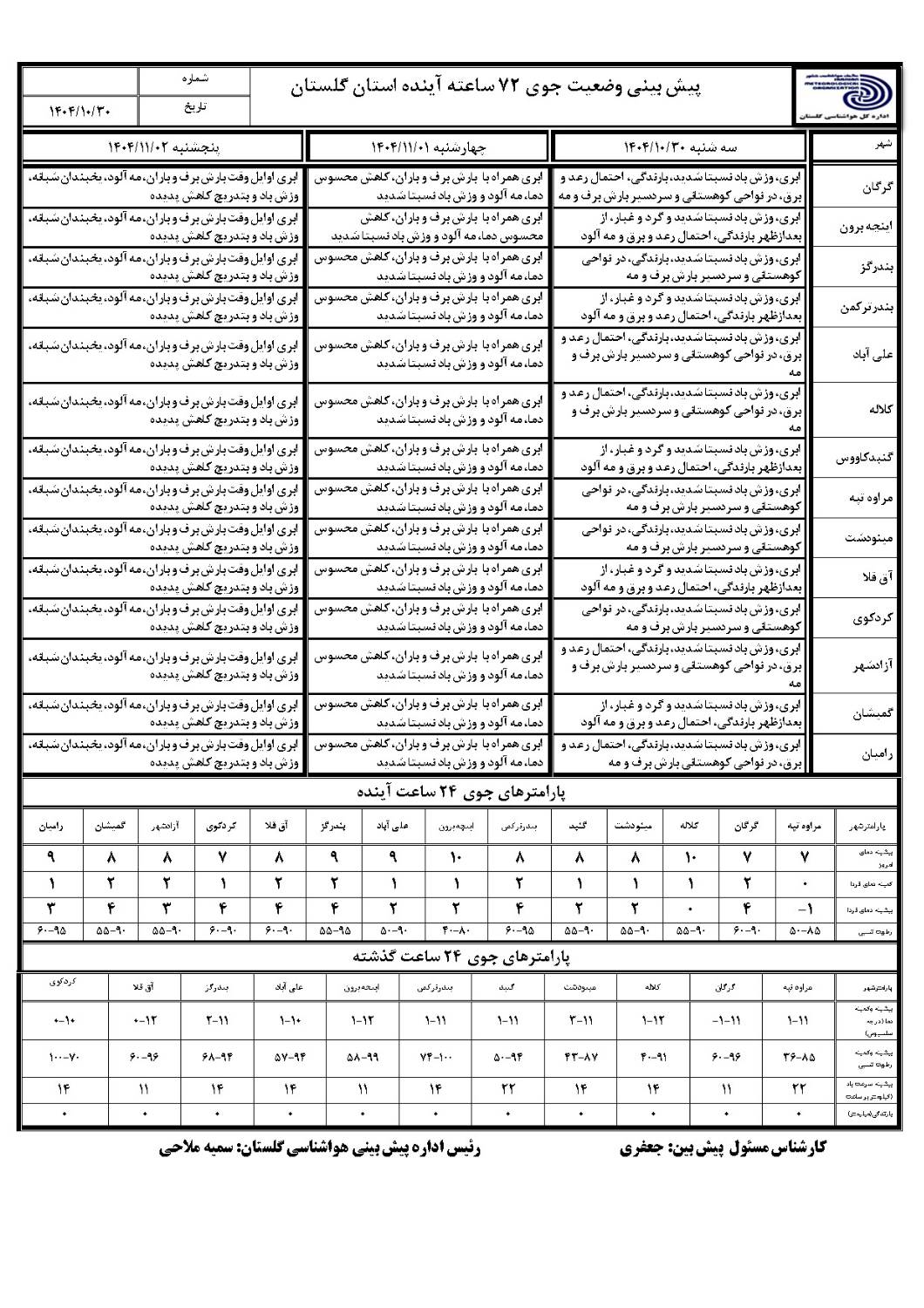 پیش بینی 72 ساعته مورخ 1404/10/30