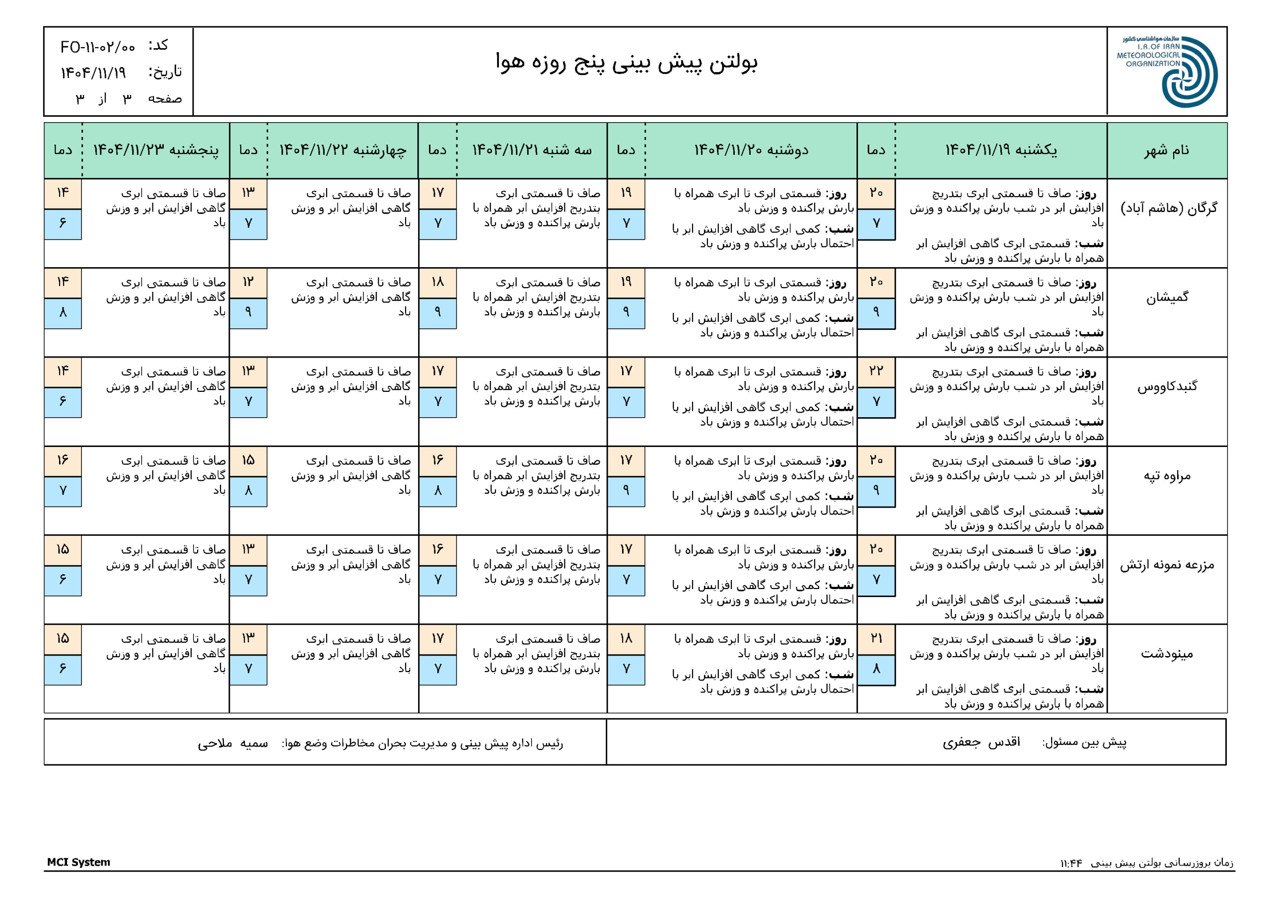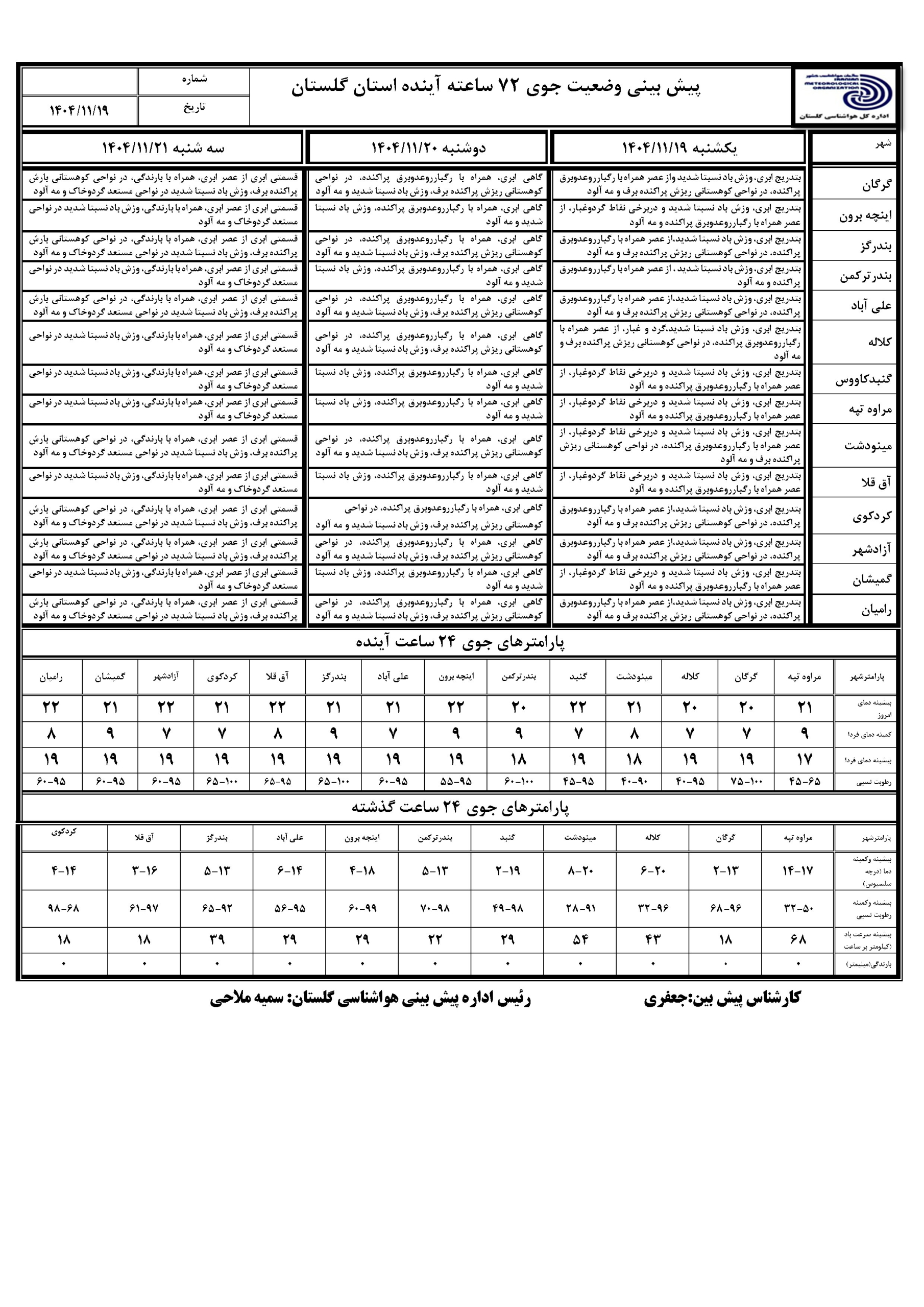 پیش بینی 72 ساعته مورخ 1404/11/19