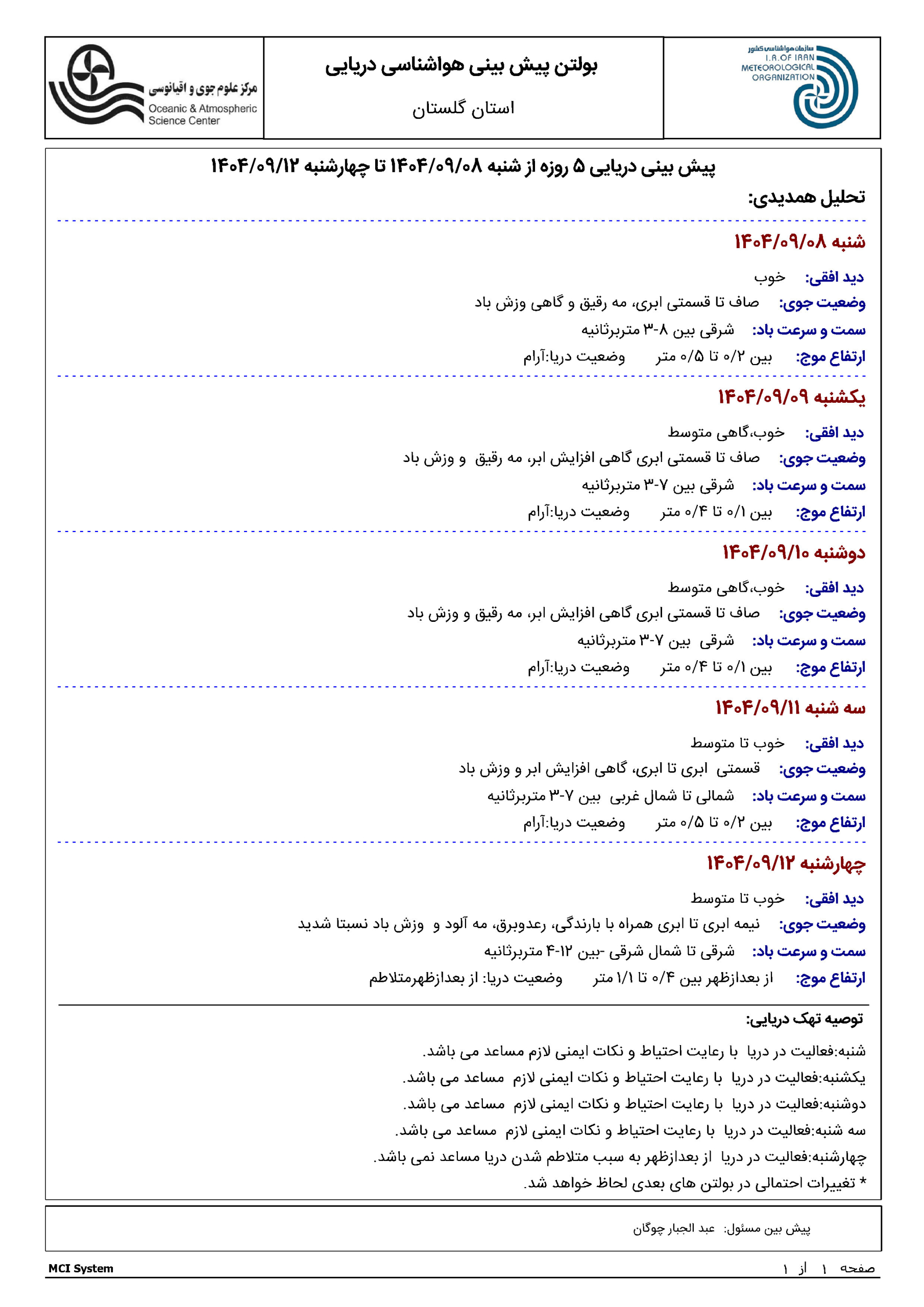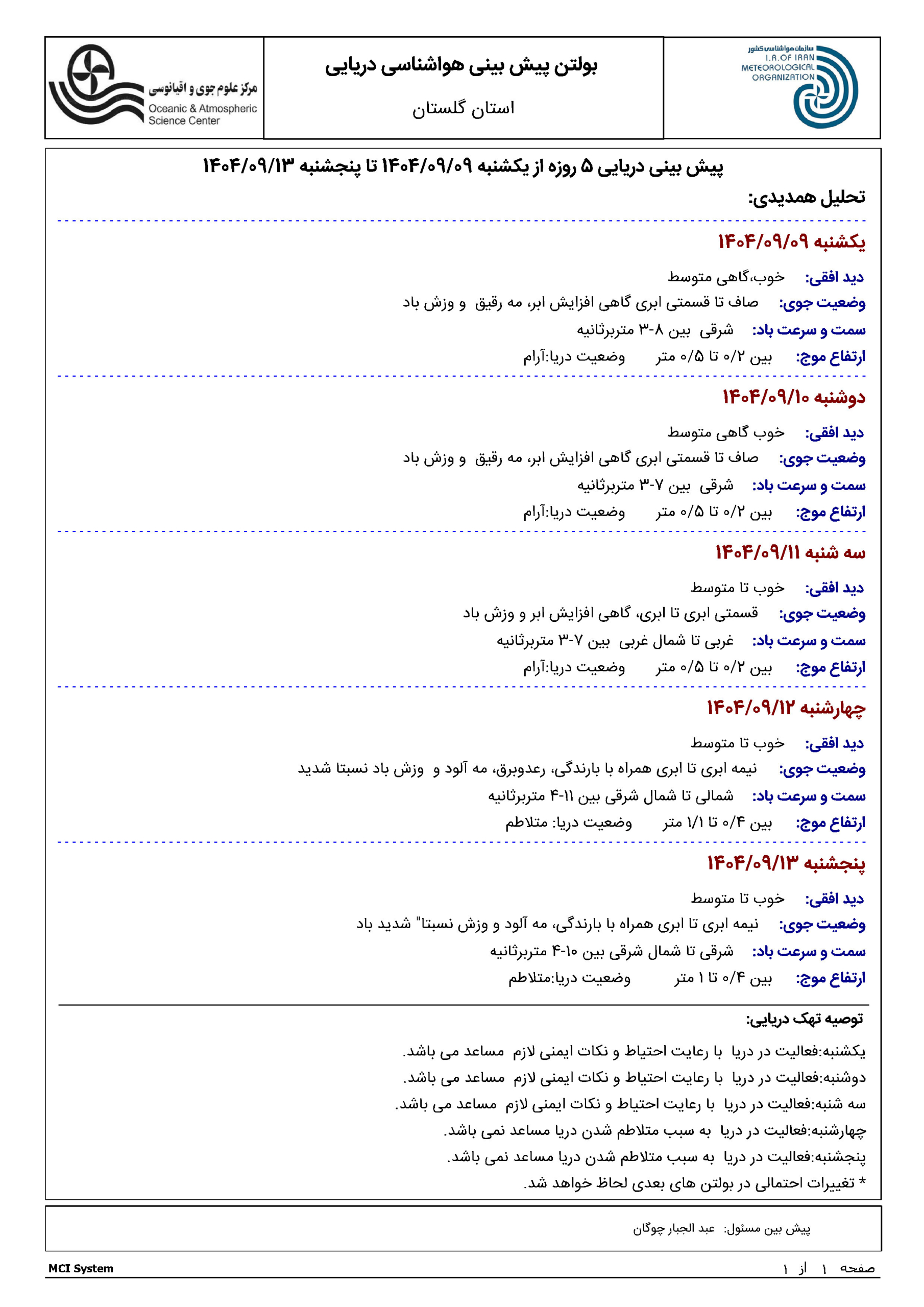 /0 دیدگاه/در پیش بینی دریایی/توسط چوگان واحد پیش بینیبولتن 5 وزه آلودگی شهرستان گرگان مورخ 1404/09/9