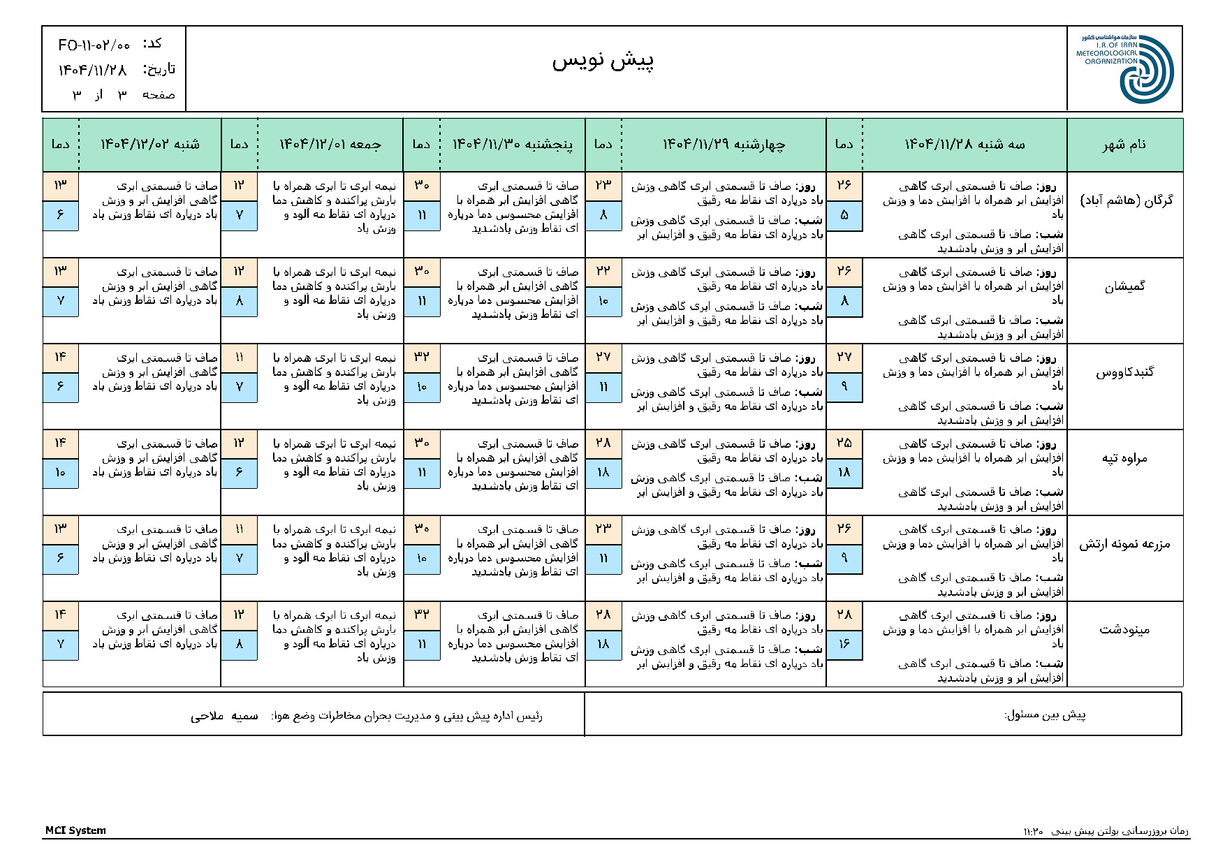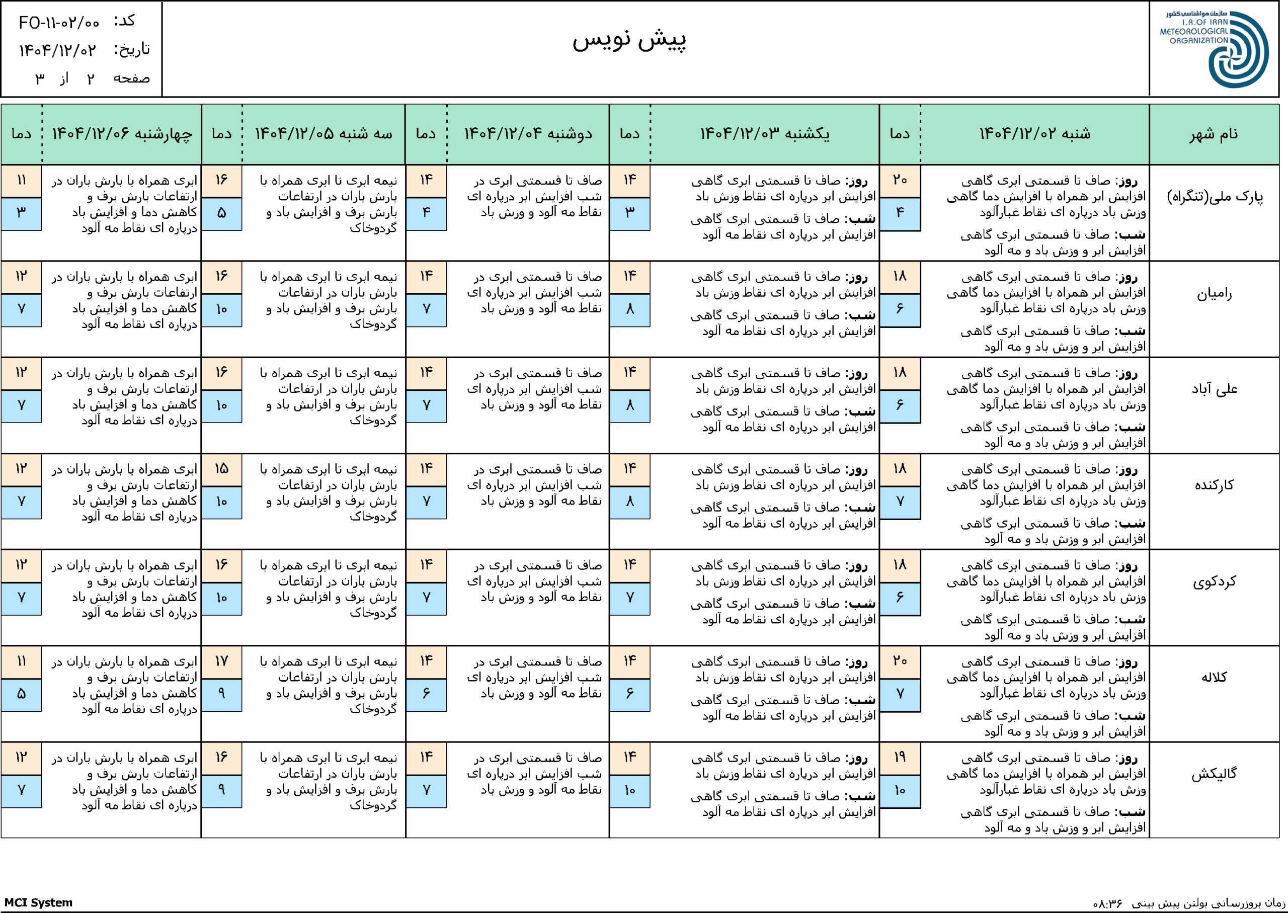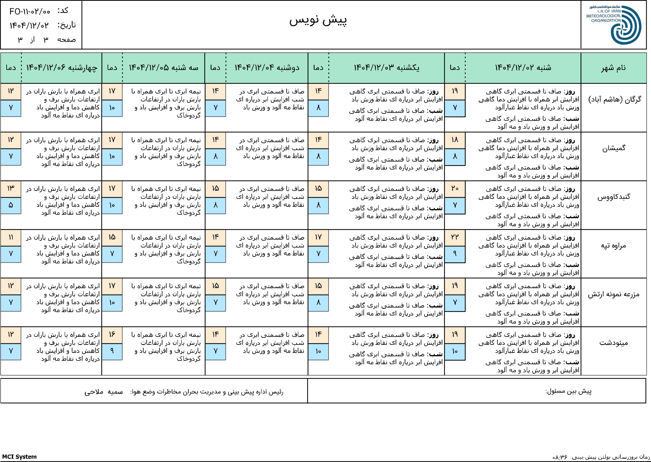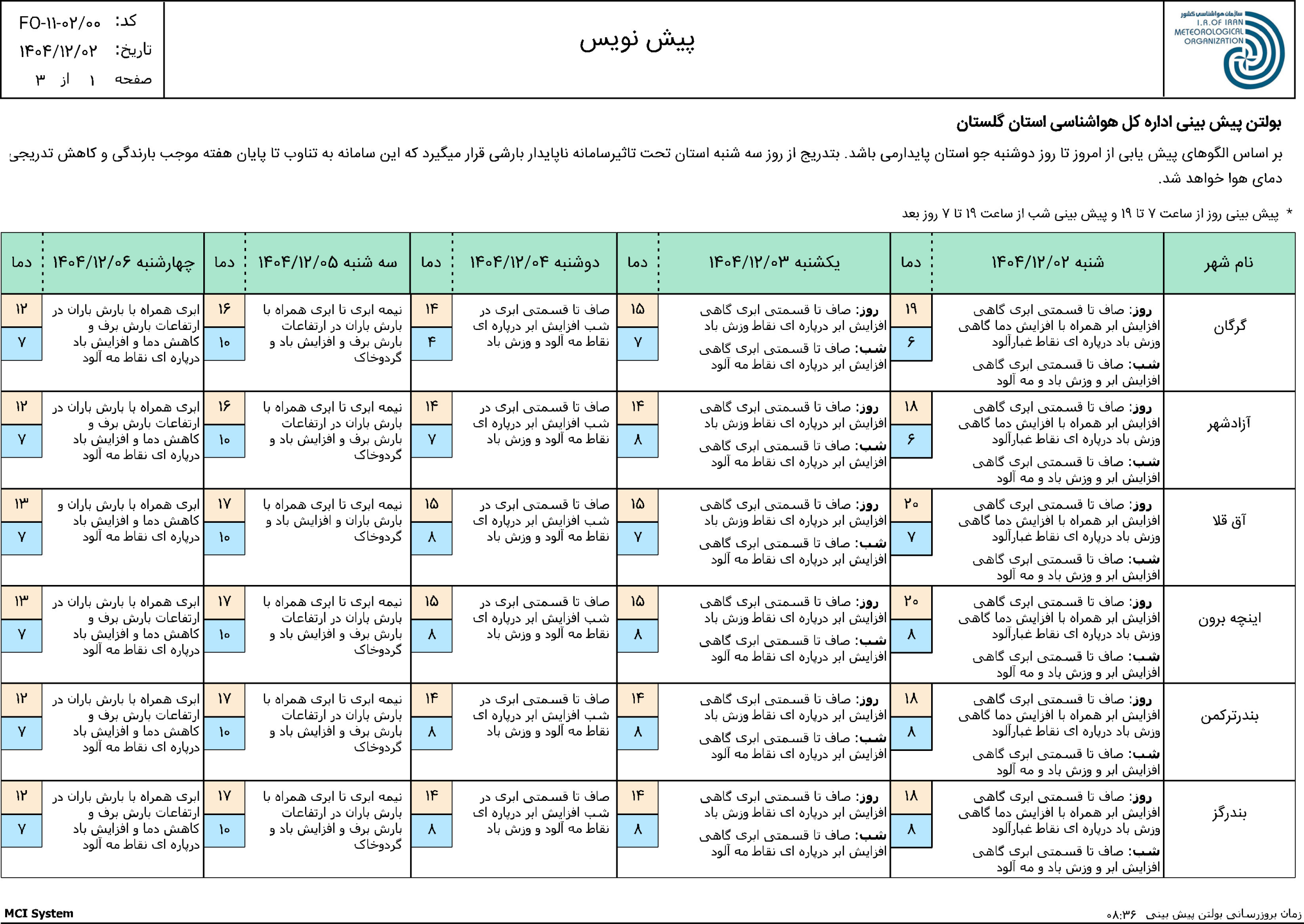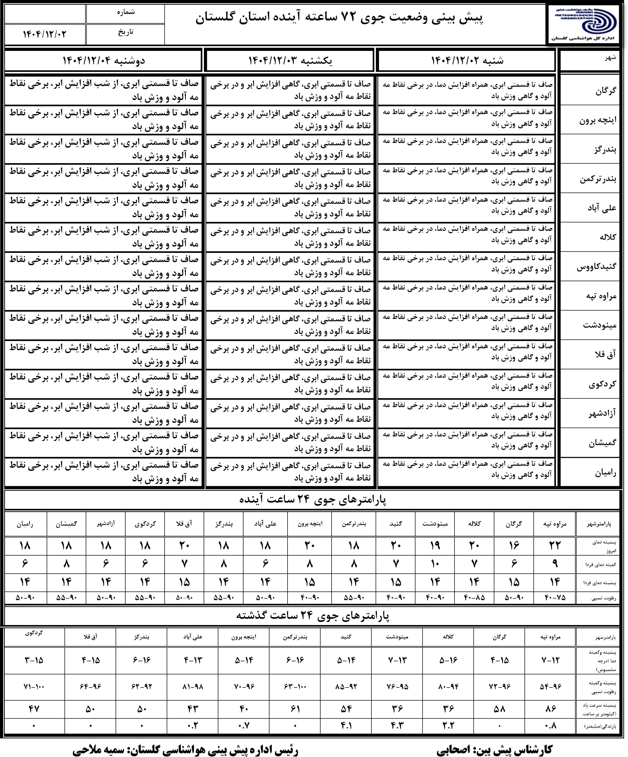 پیش بینی 72 ساعته مورخ 1404/11/25