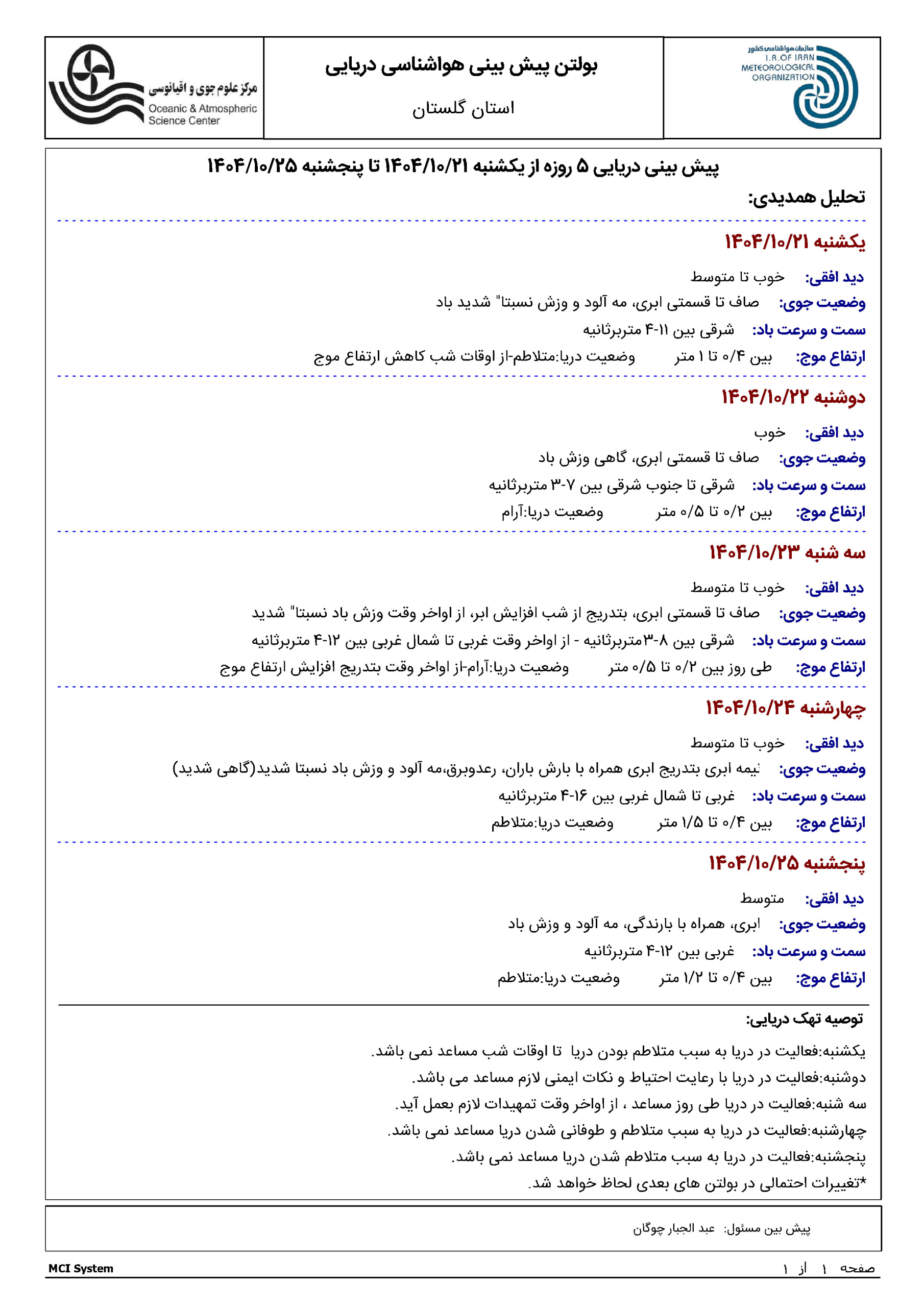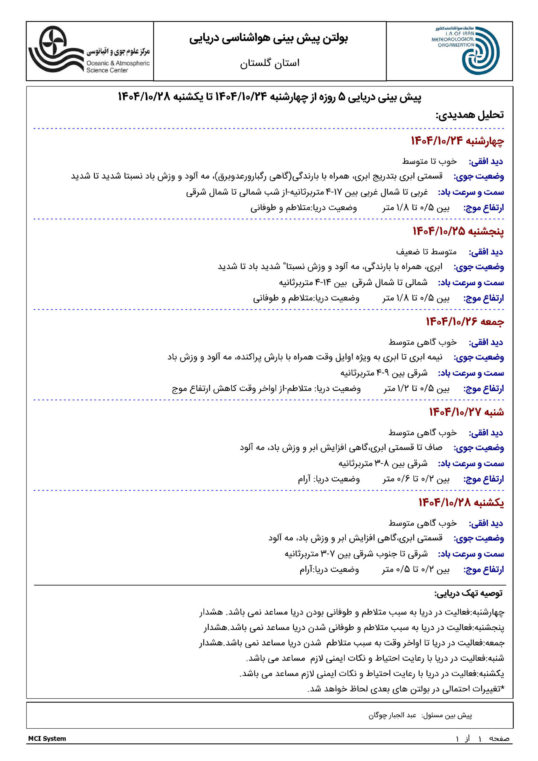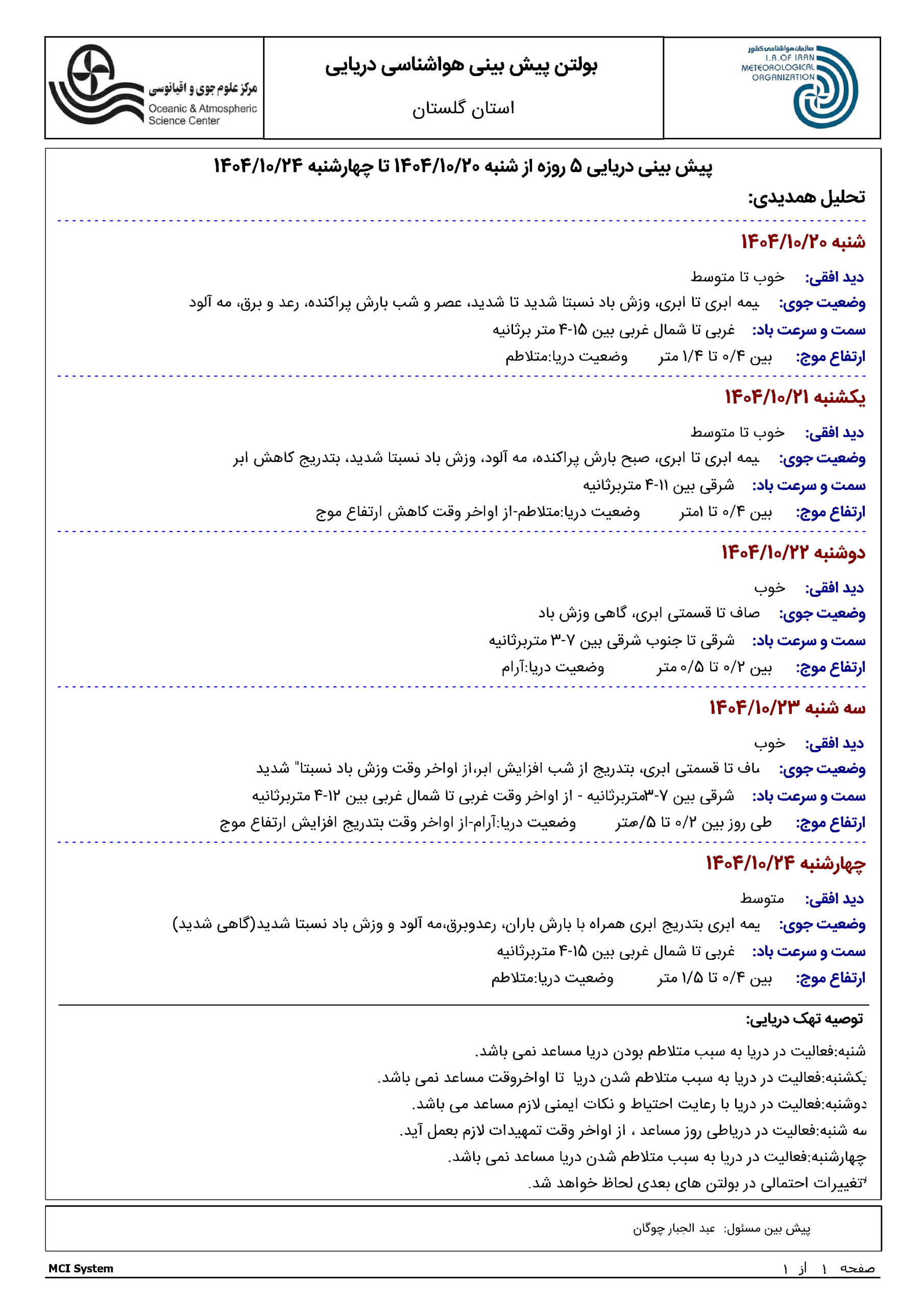 پیش بینی هواشناسی دریایی 5 روزه مورخه 1404/10/24