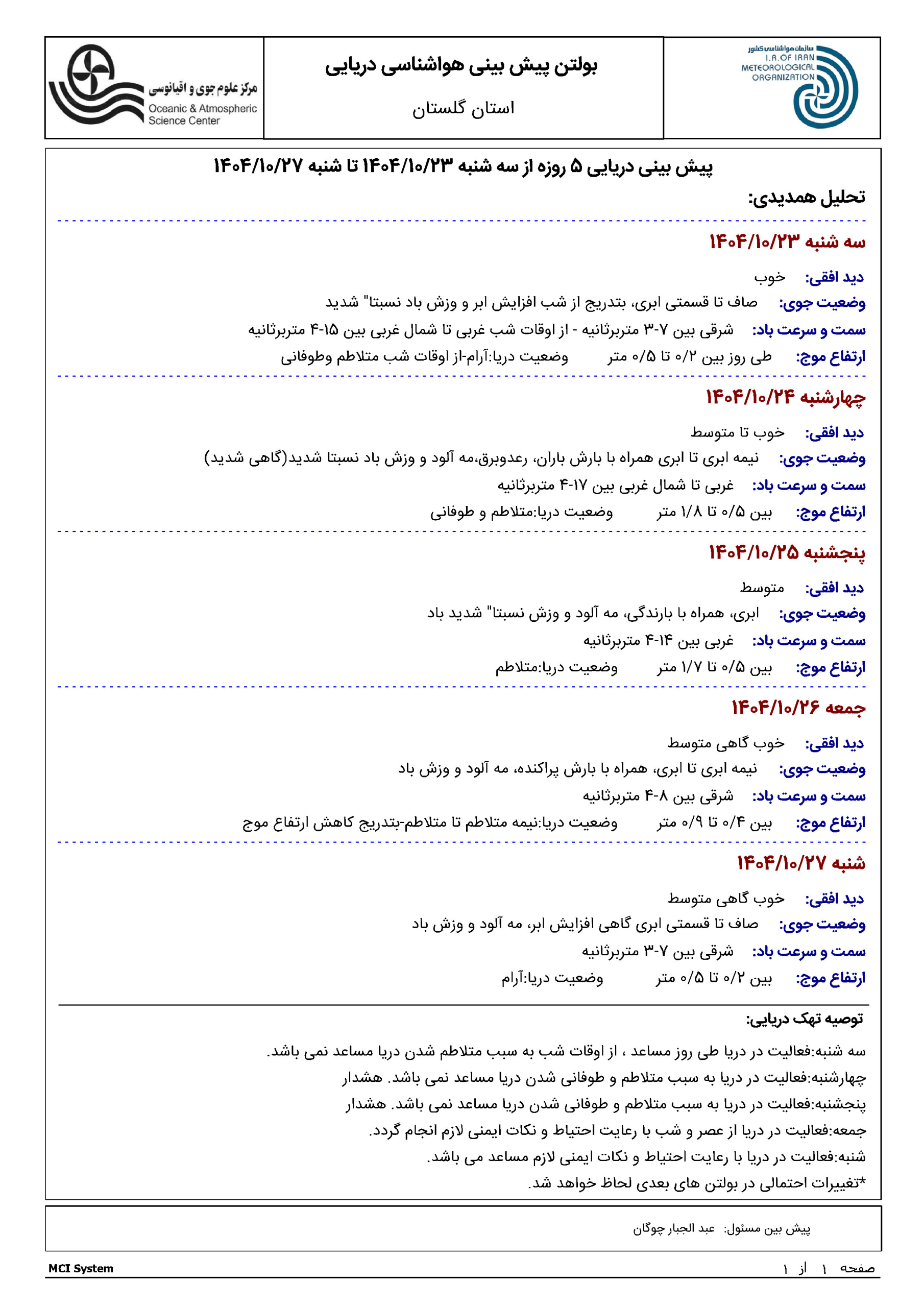 پیش بینی هواشناسی دریایی 5 روزه مورخه 1404/10/23